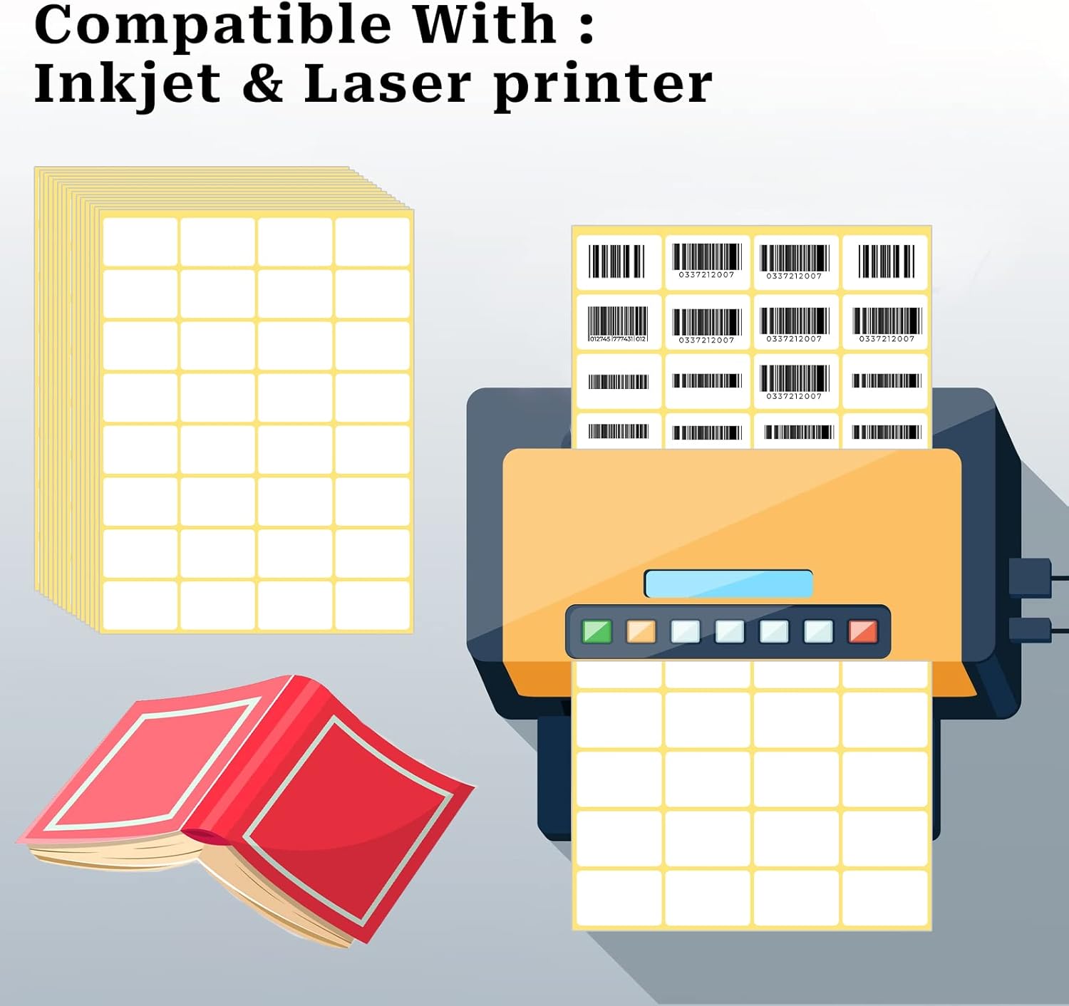 - PRINTER LABELS – Small printing labels are compatible with inkjet and laser printers. Simply place label sheet in paper tray, print, peel backing, and press down to stick to any flat surface.