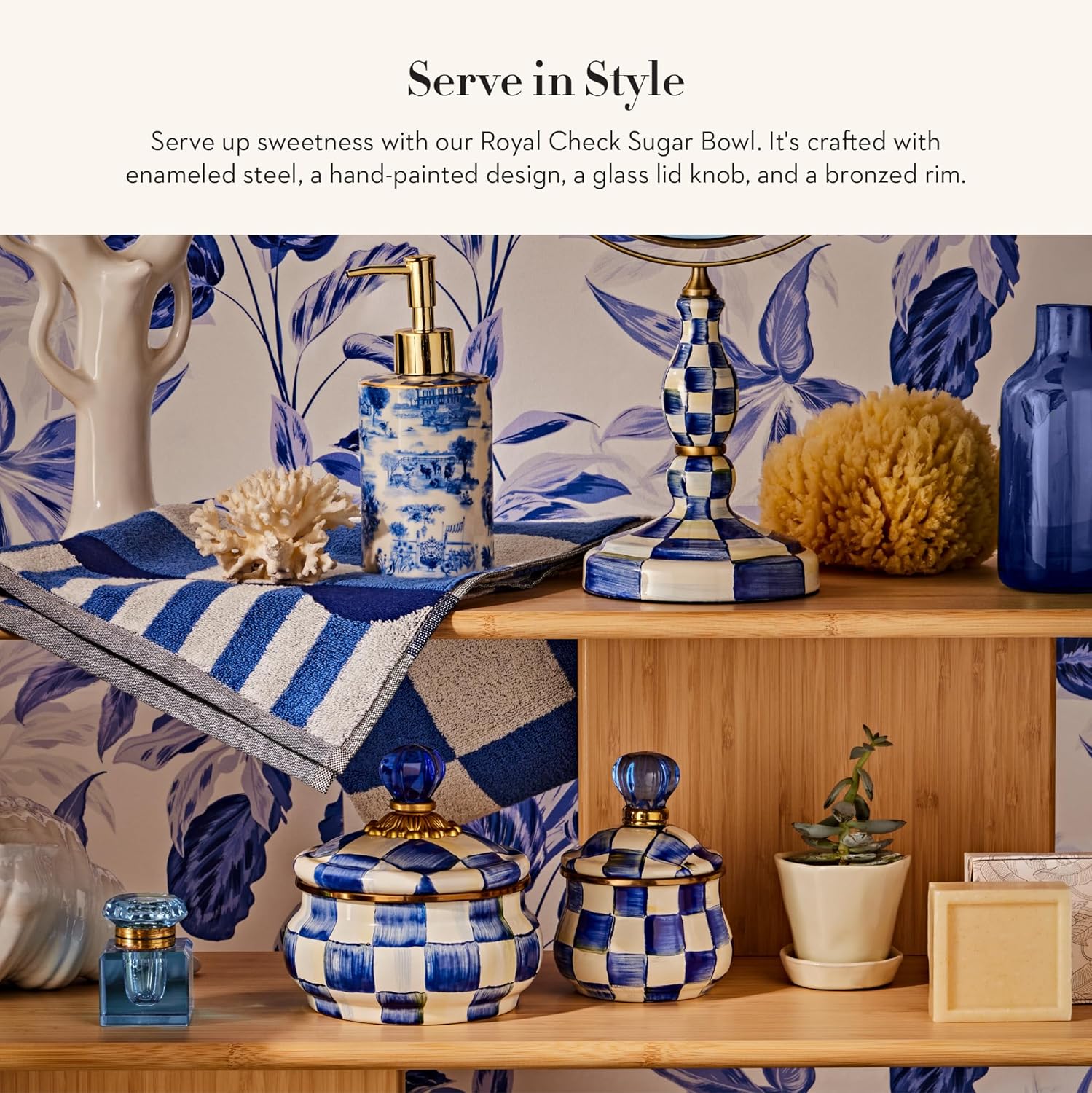 - SERVING ESSENTIAL: Serve sugar or any other spice in this small sugar jar. It features our Royal Check pattern with glossy hand-painted color-dragged blue-and-white checks on enameled steel. The lid is topped with a decorative knob.