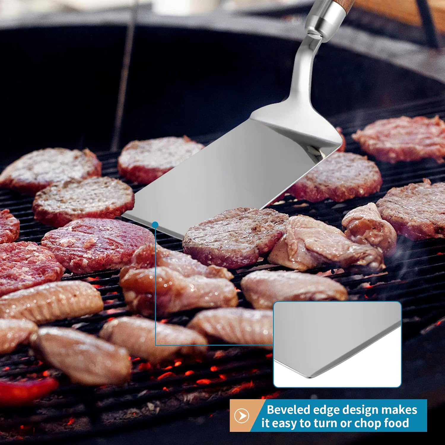 - BEVELED EDGE DESIGN: Front edge of the blade specially in bevel design, makes it much easier to turn or chop food; also great to scrape bits off the pan after cooking, perfect for your cast iron skillet, flat top grill, BBQ griddle or oven use