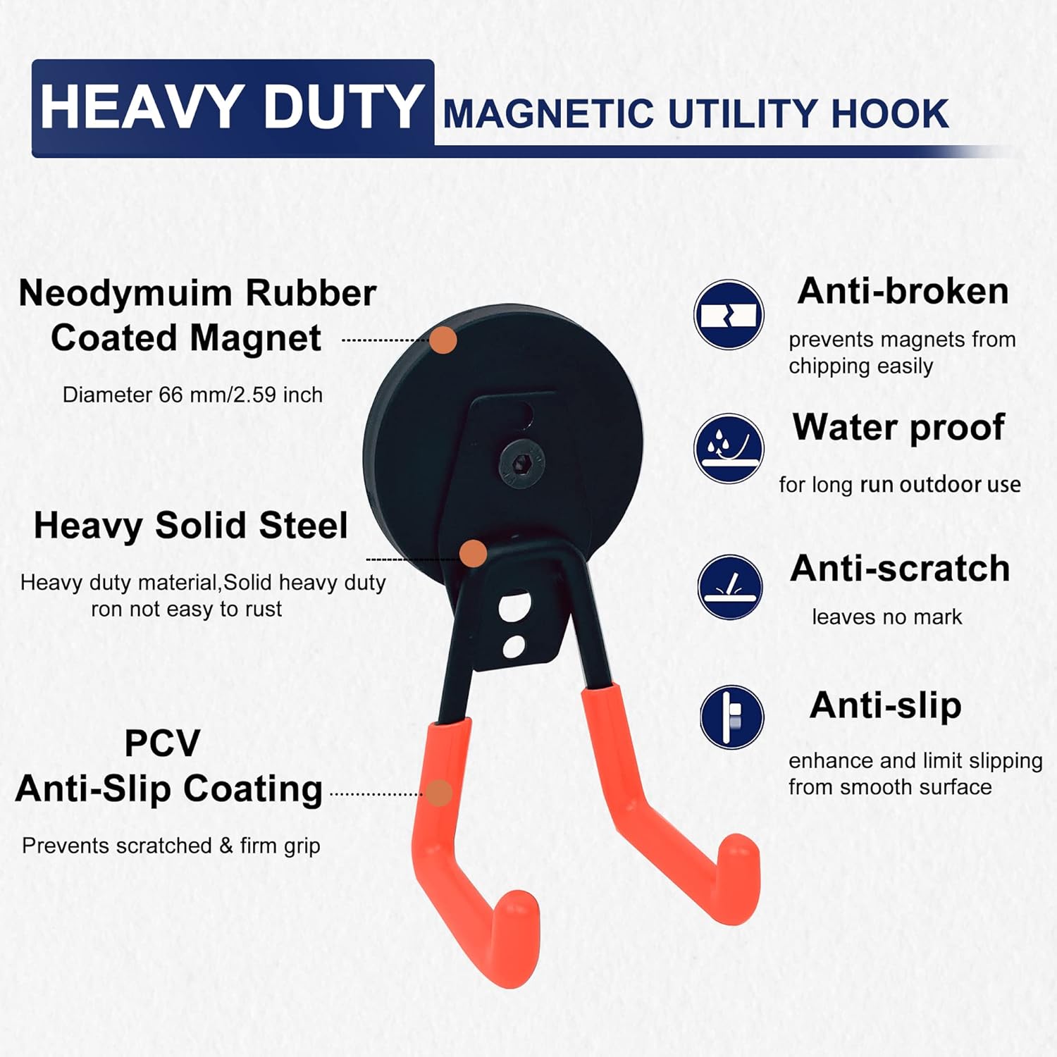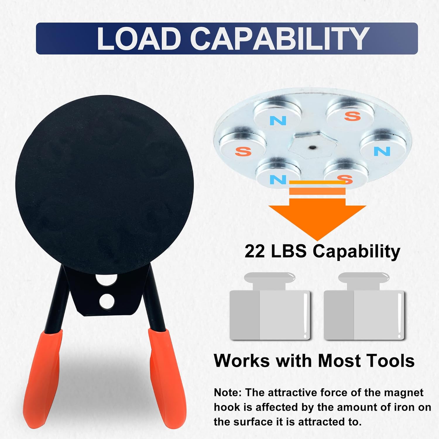 - Heavy Duty Neodymium Magnet Hooks: Each 2.59'' magnet base is equipped with 6 rare earth magnets inside. Each rare earth magnet is 0.4’’ Diameter, a total of 22 lbs load capability.