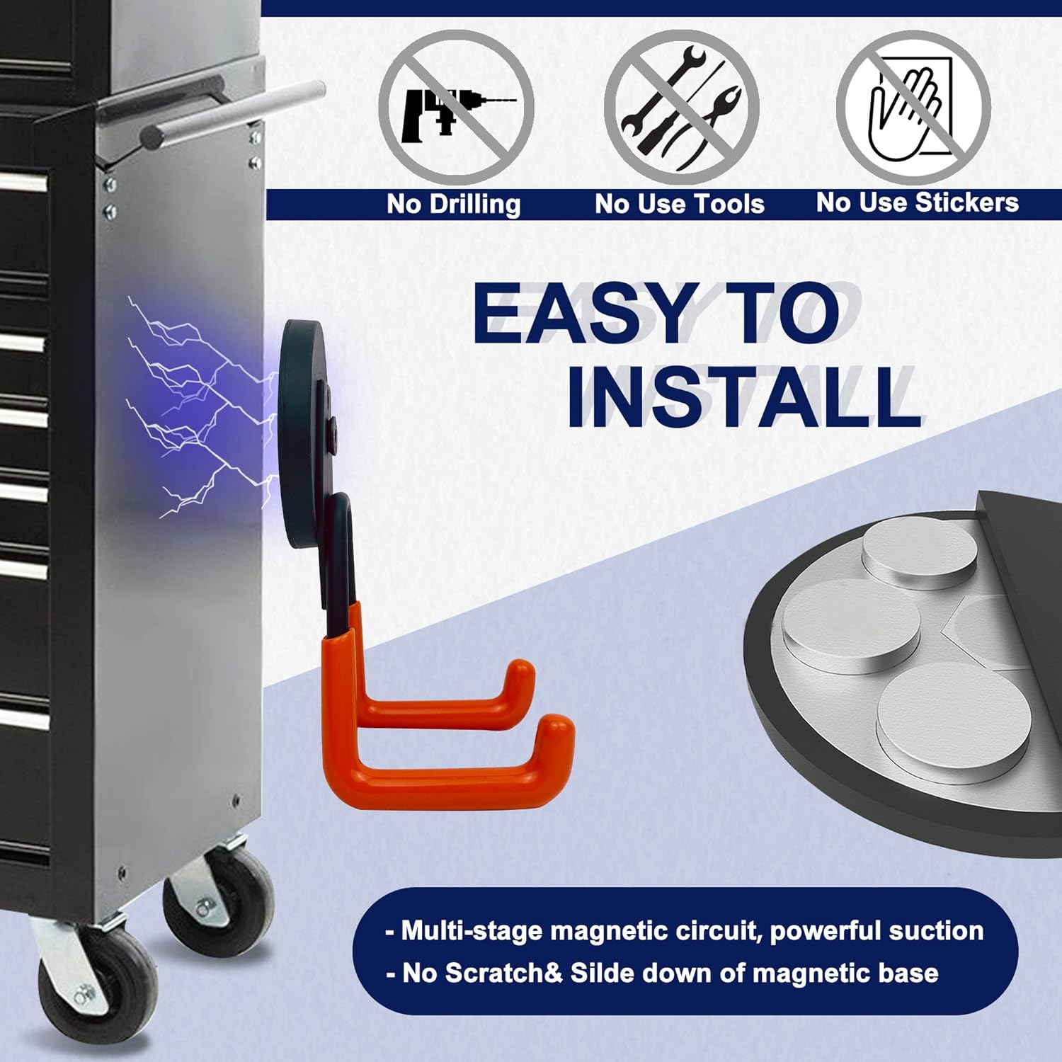 - Magnetic Utility Hooks: Compared with the single hook, our garage storage hook has two holes, which can easily support the weight and can hang most items. Applicable to scenes such as kitchens, garages, warehouses, offices, etc.Can accommodate various tools and equipment, such as hoses, skates, gym bags, shovel, rake, broom, mop and other garden tools!