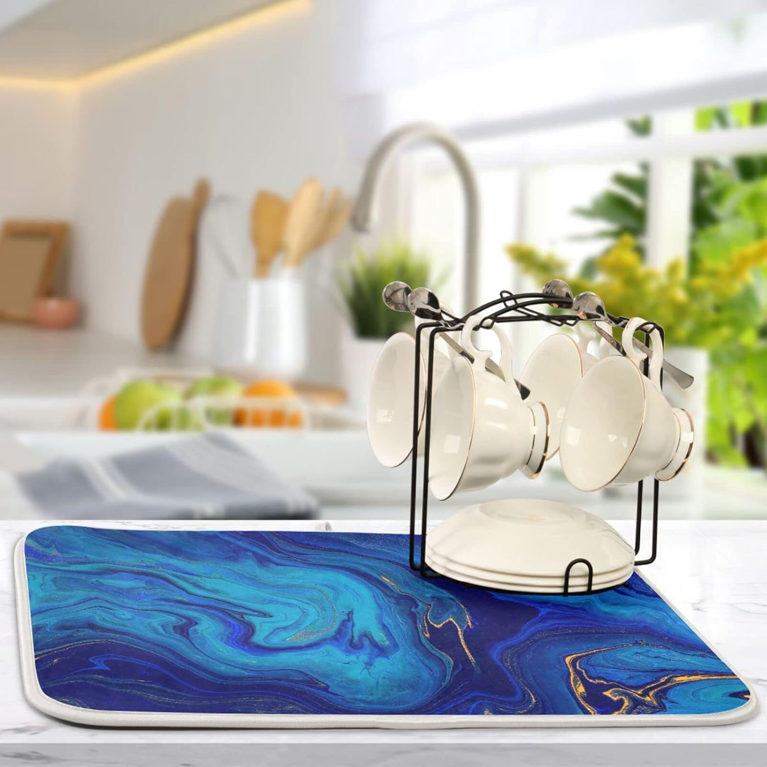 Super Absorbent Dish Drying Mat, Microfiber Fast-Drying Dish Mat, 16" x 18", Kitchen Dish Drying Pad, Navy Blue Gold Marble