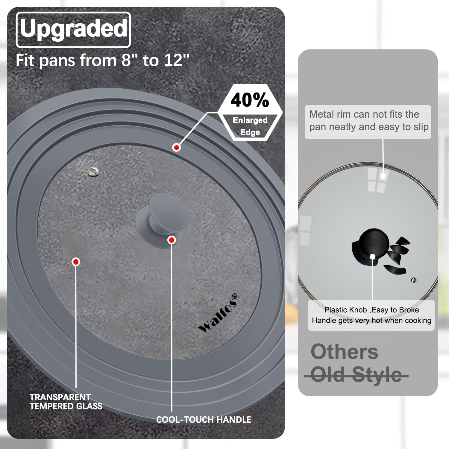 - 【Multi-Purpose】Walfos cookware and bakeware universal lids fits most pots, pans and skillets in your kitchen with diameters from 8 inch to 12 inch. Note: The lid not suitable for pots with two raised handles.