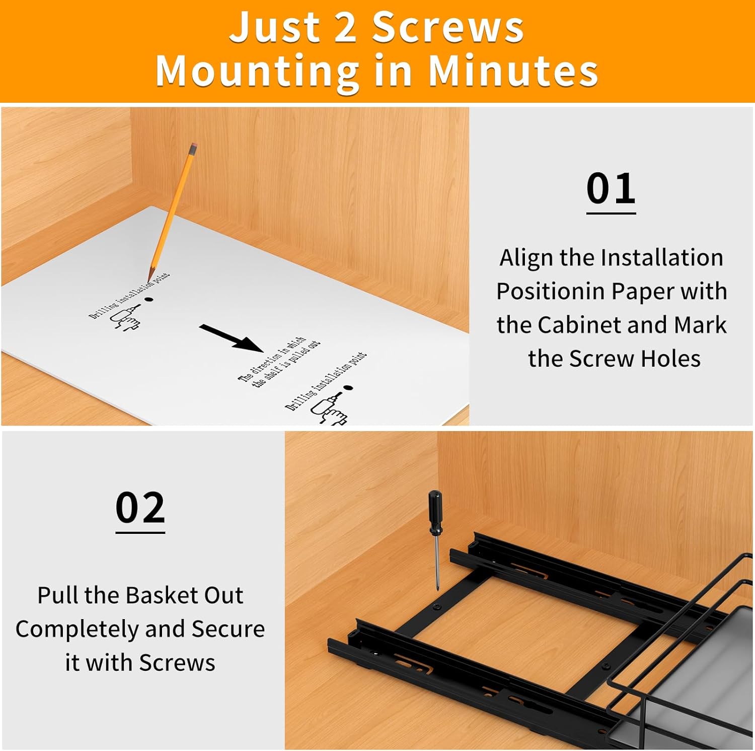 - Easy To Install: This slide out cabinet spice organizer Measuring 10.5"D x 6.5"W x 2.5"H. Requires at least 7”W x 11"D cabinet. Please confirm your cabinet size before you order. Includes installation instructions and all necessary accessories. Simply tighten the 2 screws to install and you have a solid spice rack in your cabinet.