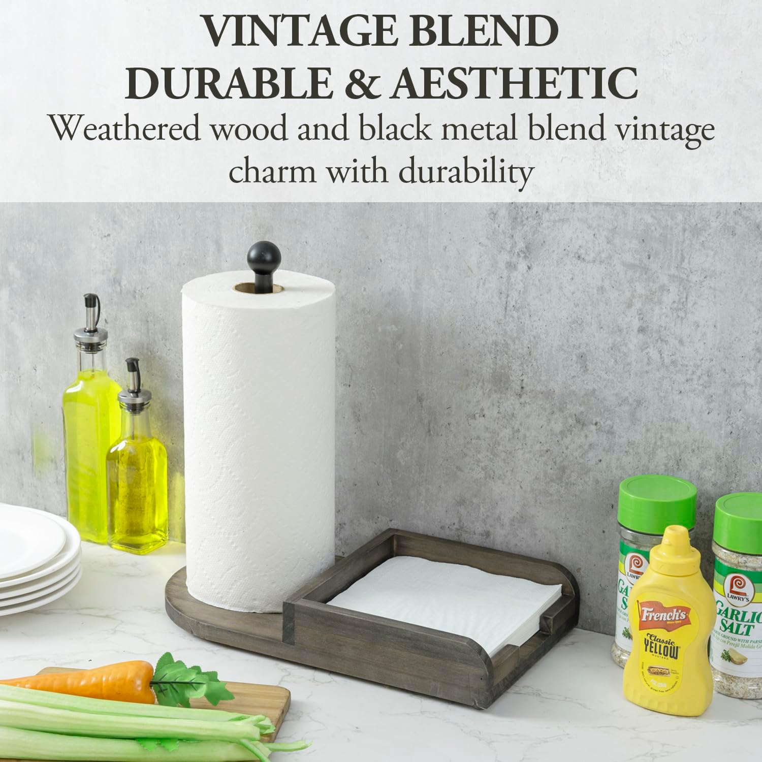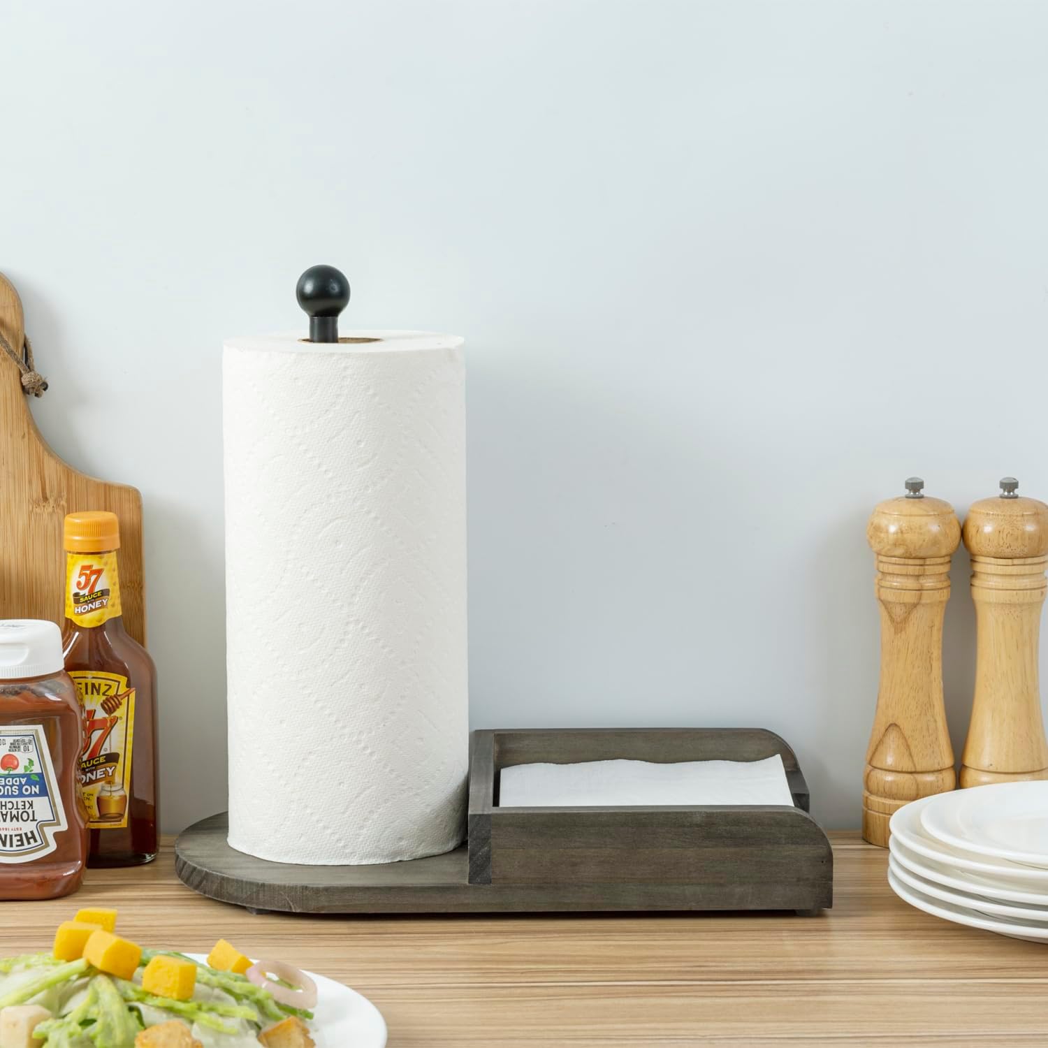 - 2-in-one combination wooden rack with vertical paper towel roll holder and napkin tray for kitchen storage and dining convenience **Paper towels and napkins not included**