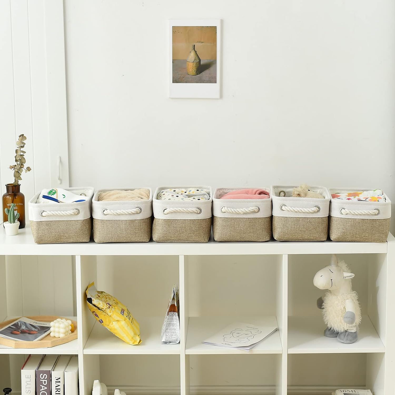 TheWarmHome Storage Basket for Shelves - 12x8x5.2 inch Small 6 Pack Collapsible Storage Bin for Closet with Handles, Fabric Storage Cubes for Cloth Organizer Gift Toy Decorative (White & Khaki)