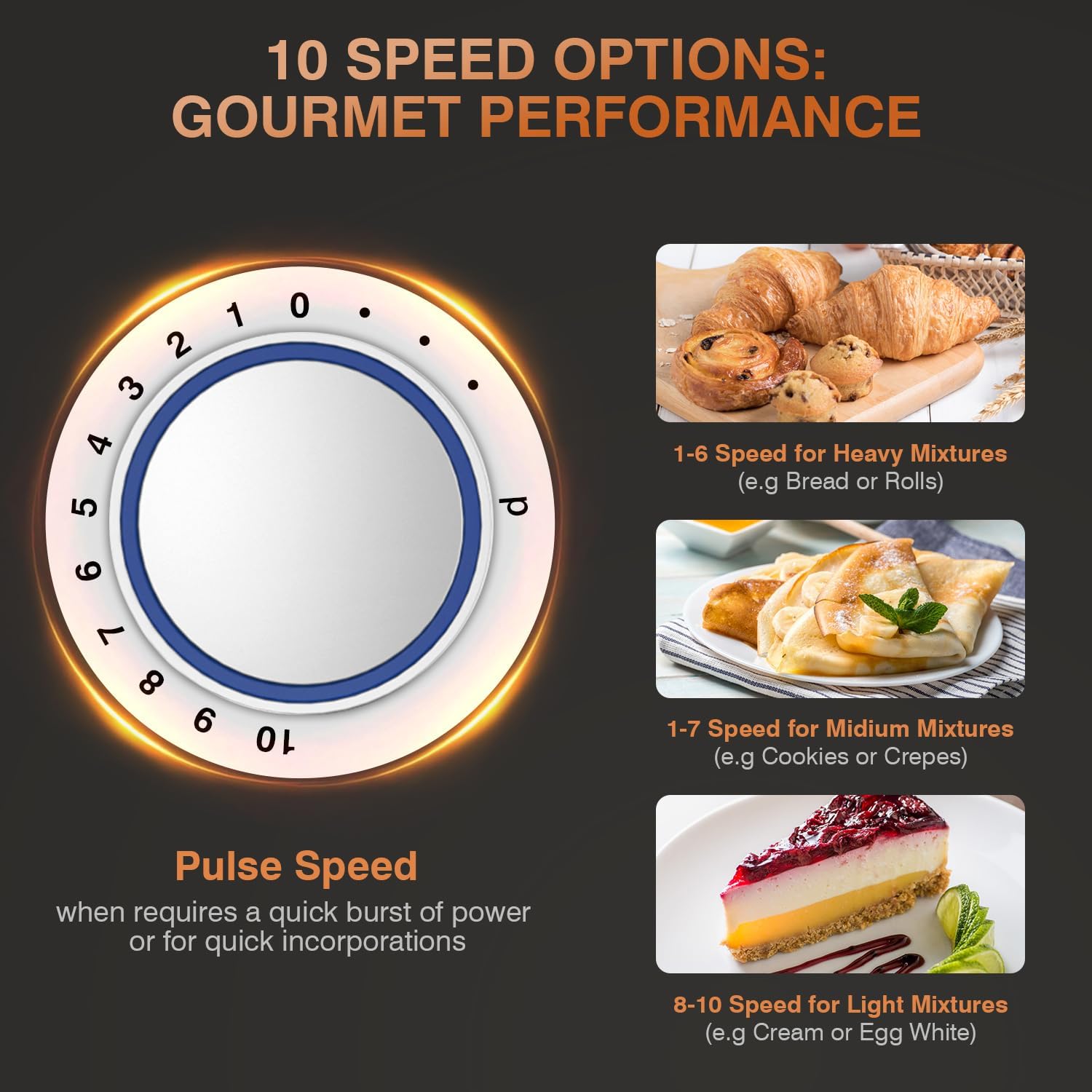 - 【3+1 Attachments, Easy to Clean】Compared with chef machines of the same type, our dough hooks and mixing beater cleanups quickly with a safe, non-stick coating that leaves no trace elements in your food. And it will not turn black after repeated use. For the whisk, wash it with your hand. Besides, the scraper helps you easy to take out the food and clean the bowl.