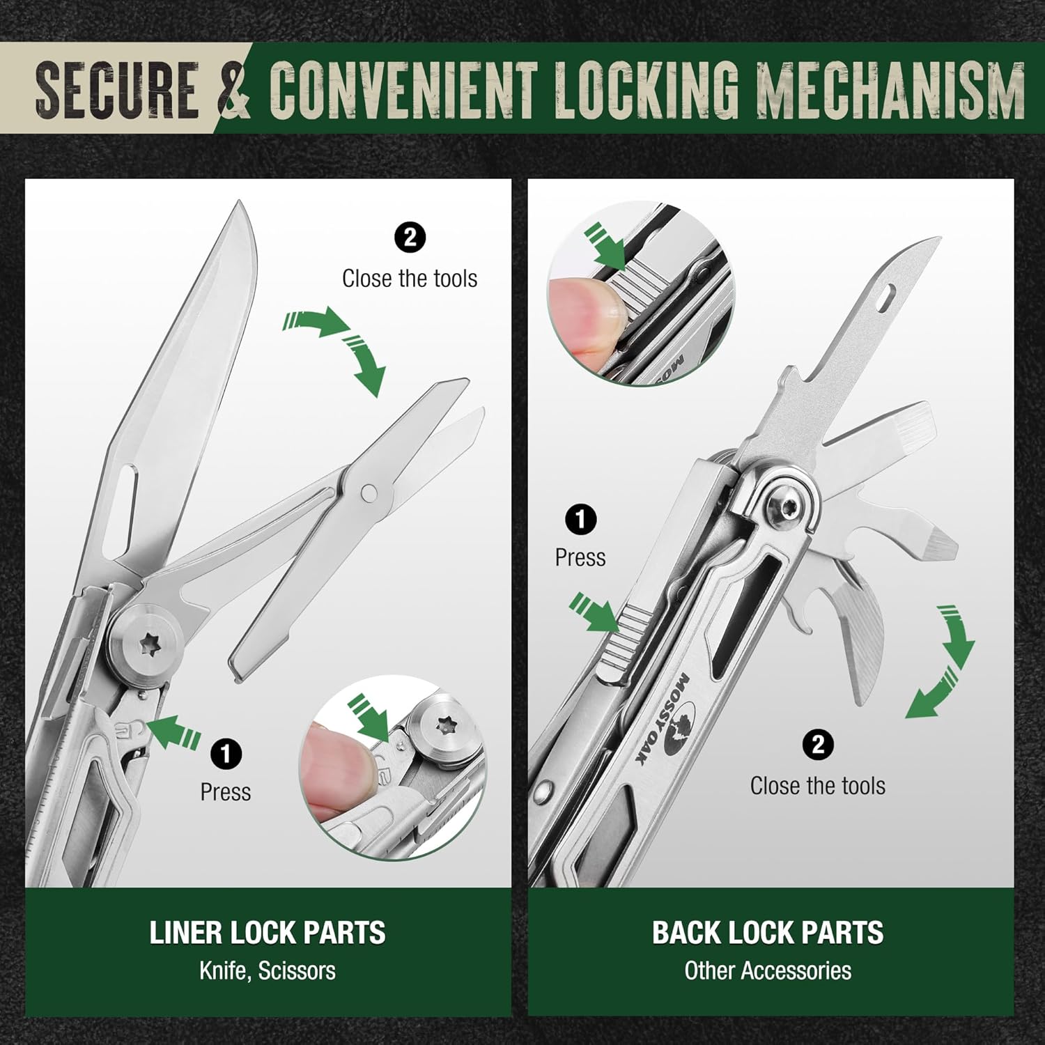 Mossy Oak 12-in-1 Multitool Pocket Knife with Pouch, Stainless Steel Multitool Knife with Clip, Survival Tools with Scissors, Bottle Opener, Wire Stripper, Glass Breaker, Screwdriver