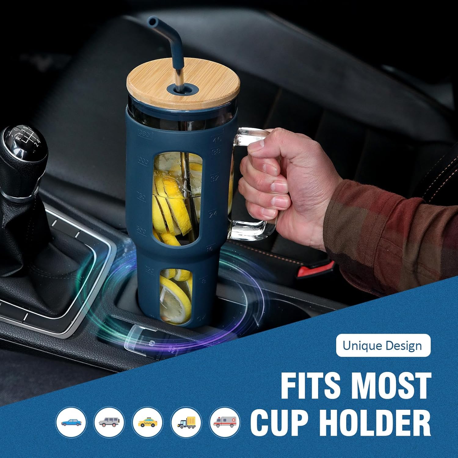 - DEVELOPED FOR CAR CUP HOLDERS-Glass cups with lids and straws specially designed for car cup holders. Perfectly sized designed to hold 46oz of hot tea and iced coffee. The smoothie cup can be safely placed in most car cup holders.