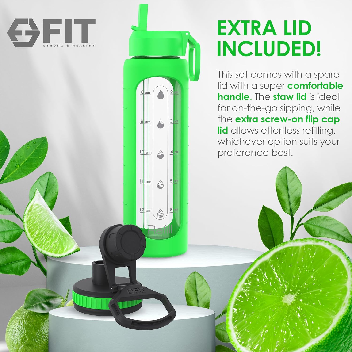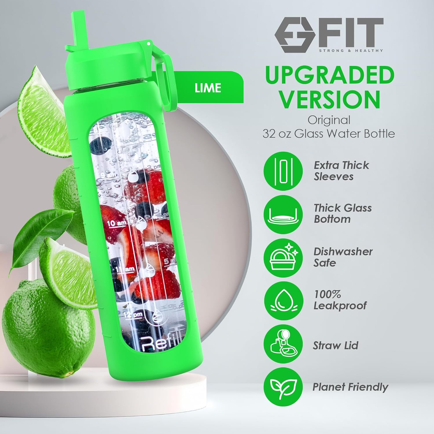 FIT Strong & Healthy 32 oz Glass Water Bottle with Straw Lid, Time Marker, Sleeve & Extra Lid - Motivational, Wide Mouth 1 Liter Glass Drinking Bottle