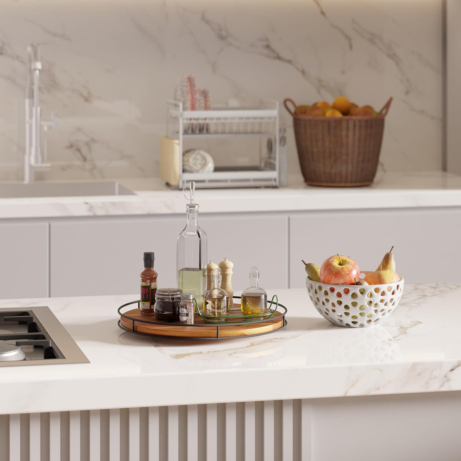 - Sturdy Steel Frame: The circular steel frame surrounding the lazy Susan stands at a substantial 1.6 inches in height. This thoughtful design controls items from accidentally sliding or falling off, providing an extra layer of security and making it suitable for both regular use and special occasions.