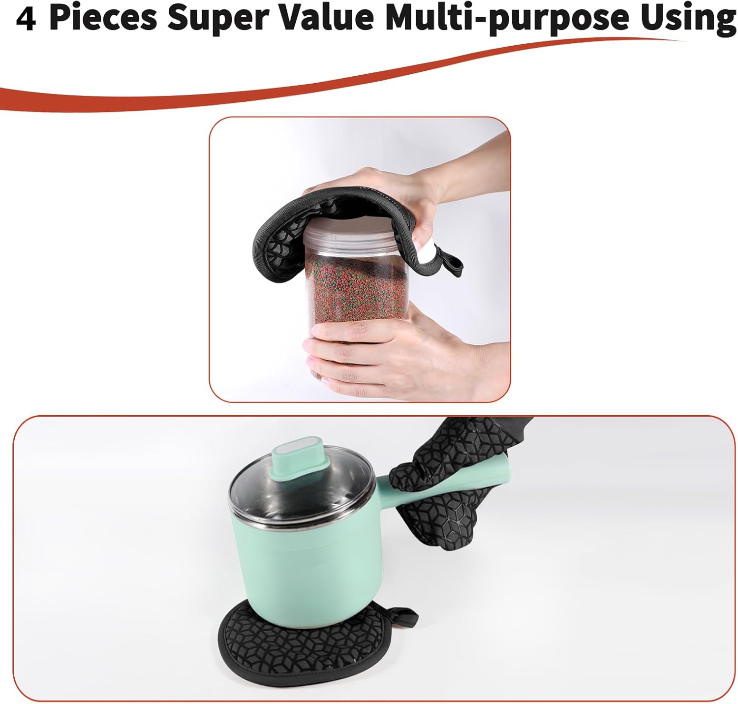 - 【Heat resistant up to 500 °F】oven mitts and pot holder set is heat-resistant up to 500 ℉Thanks to the nice workmanship, the heat- resistant oven mitts for kitchen are very comfortable to wear. Whether you are taking out a frying pan from the oven or taking care of a hot grill,you can ensure that our oven gloves can reliably protect your hands from burns.