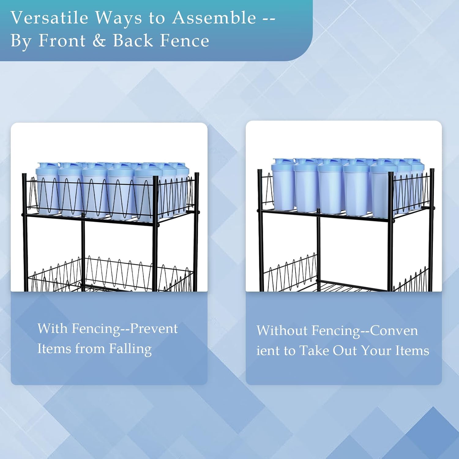 - 【Metal Frame & Adjustable Feet】The water bottle organizer is made of metal material, which ensures the water bottle holder cooler jug rack organizer's stability and durability. Besides, coated surface makes the water bottle rack waterproof and can avoids to rust. 4 adjustable feet can also makes the kitchen storage rack still stand on the uneven ground.