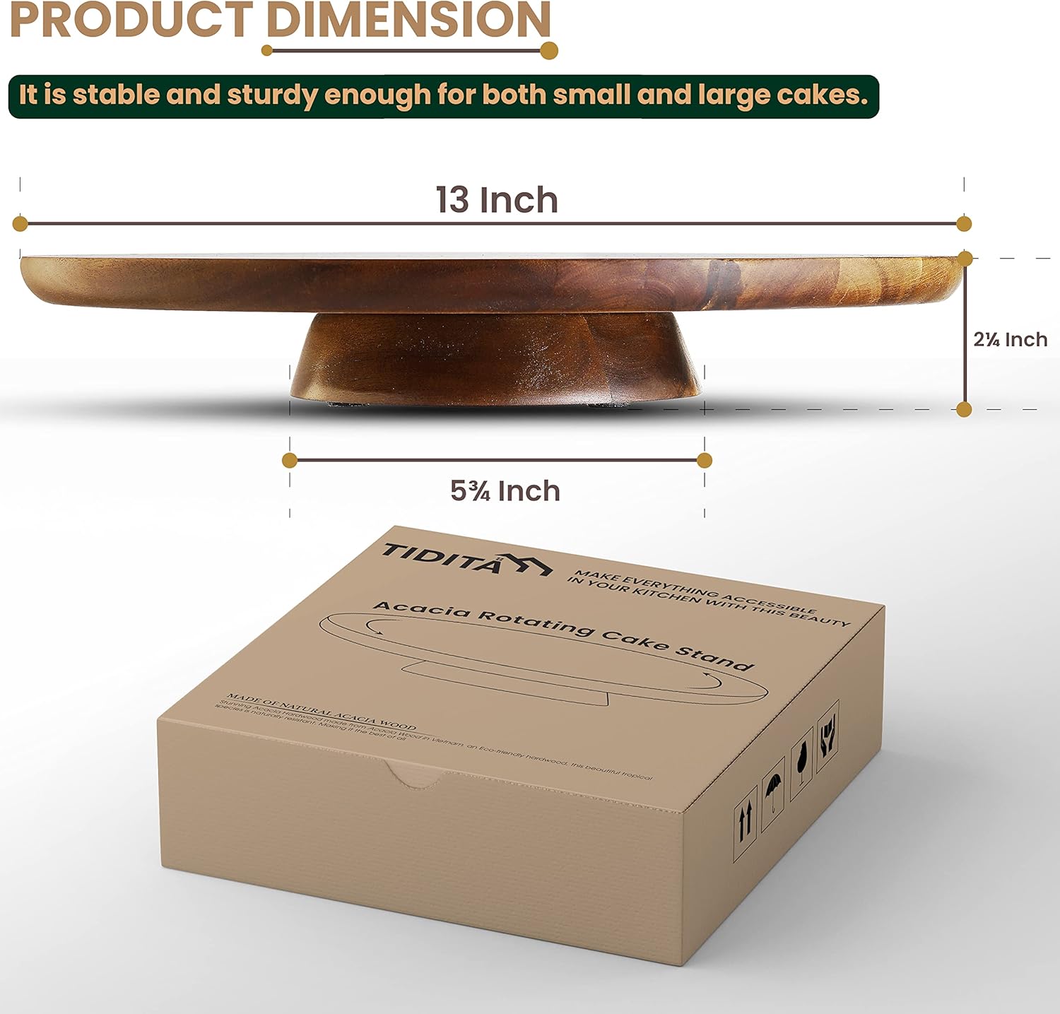 13" Acacia Cake Stand Rotating – Rustic Wood Turntable Pedestal Stands – Wooden Spinning Tables for Food Serving - Round Cake Decorating for Cupcake Dessert Display in Party, Wedding, Birthday