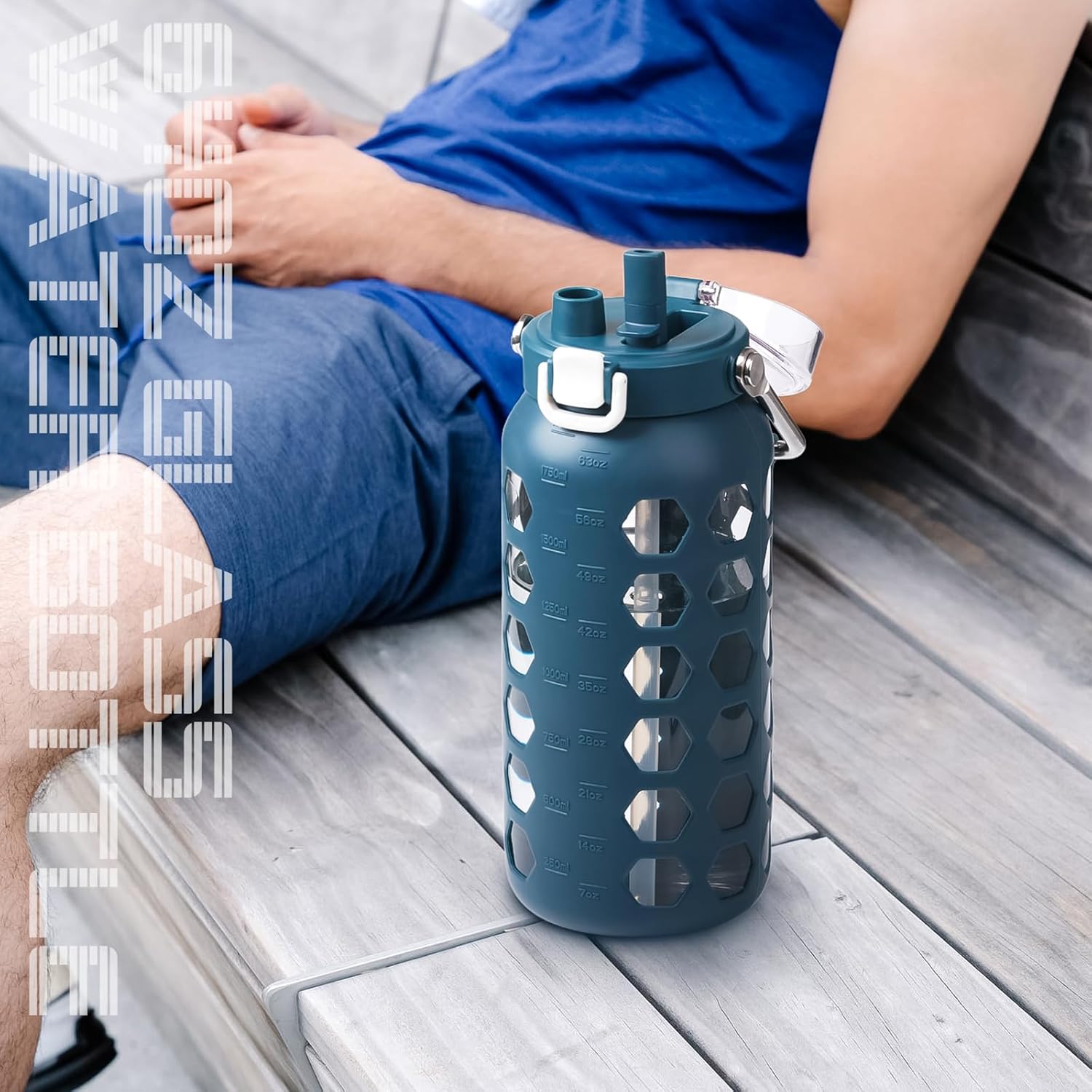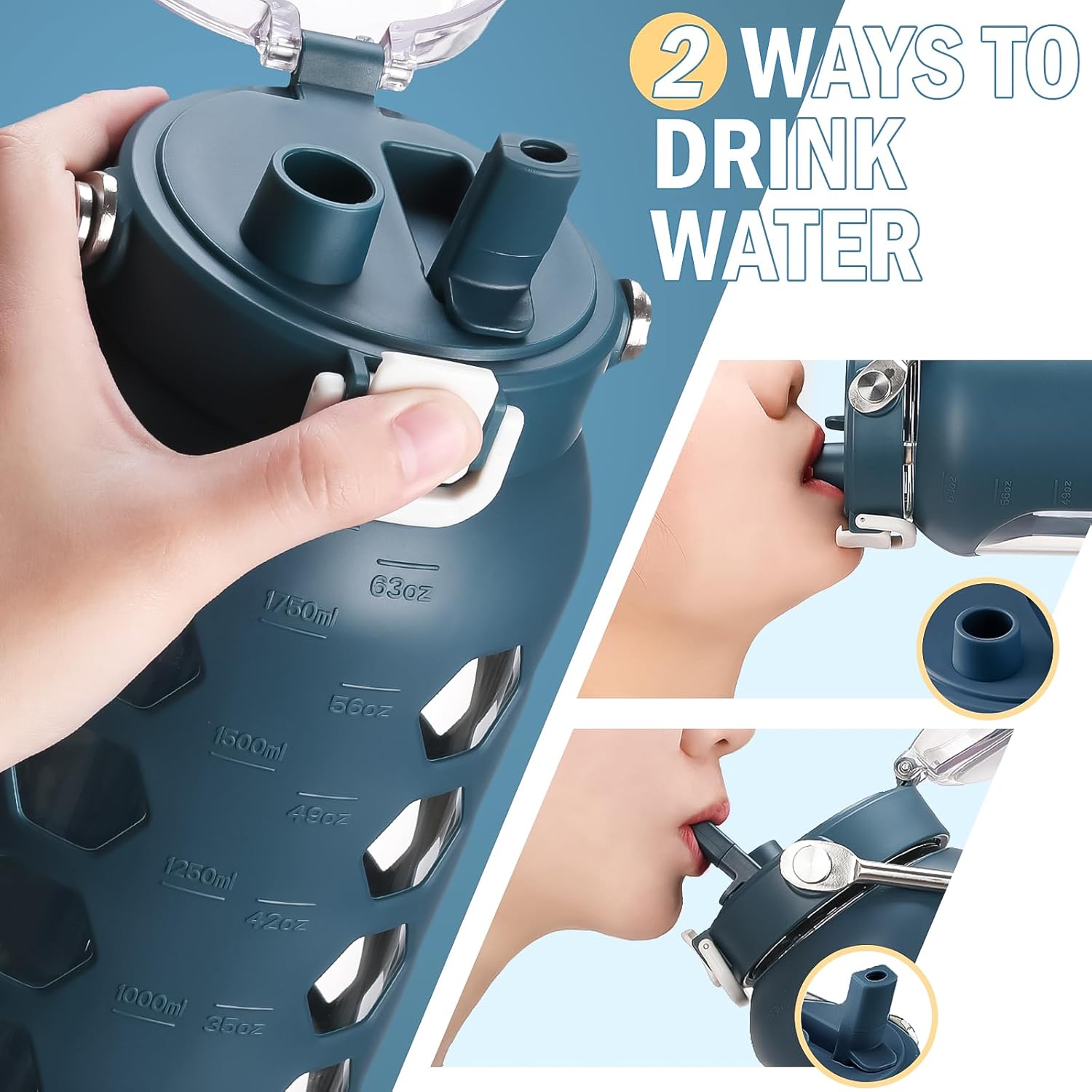 MUKOKO 64oz Glass Water Bottles with Straw and Lid,Half Gallon Water Bottle with Time Marker,Large Glass Water Jug with Silicone Sleeve and Stainless Steel Handle-Blue