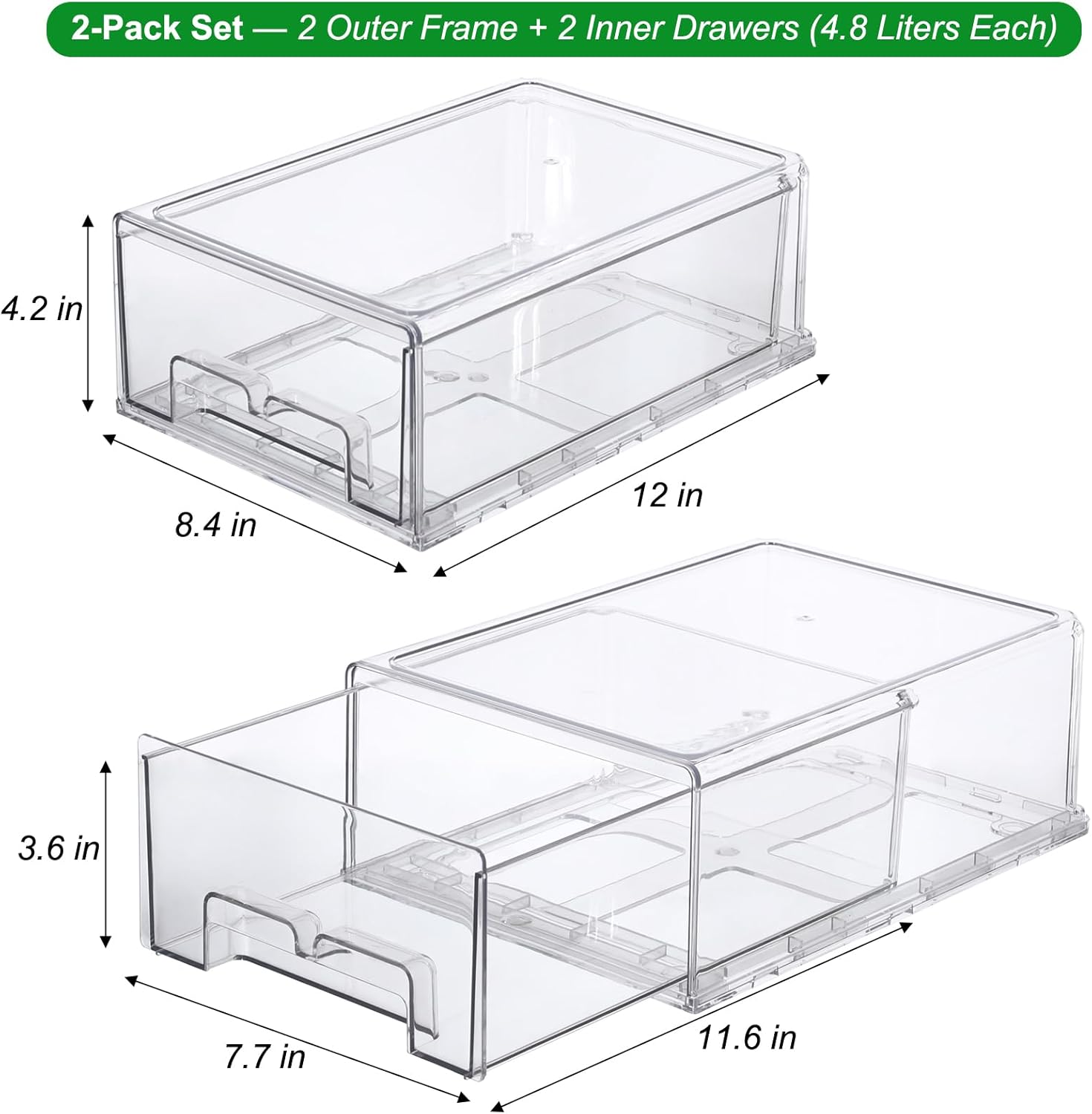Taiuloo 2 Pack Stackable Refrigerator Organizer Bins with Pull-Out Drawer, Clear BPA-Free Food Storage Containers for Fridge Freezer, Kitchen Pantry Cabinet & Bathroom Vanity Organization