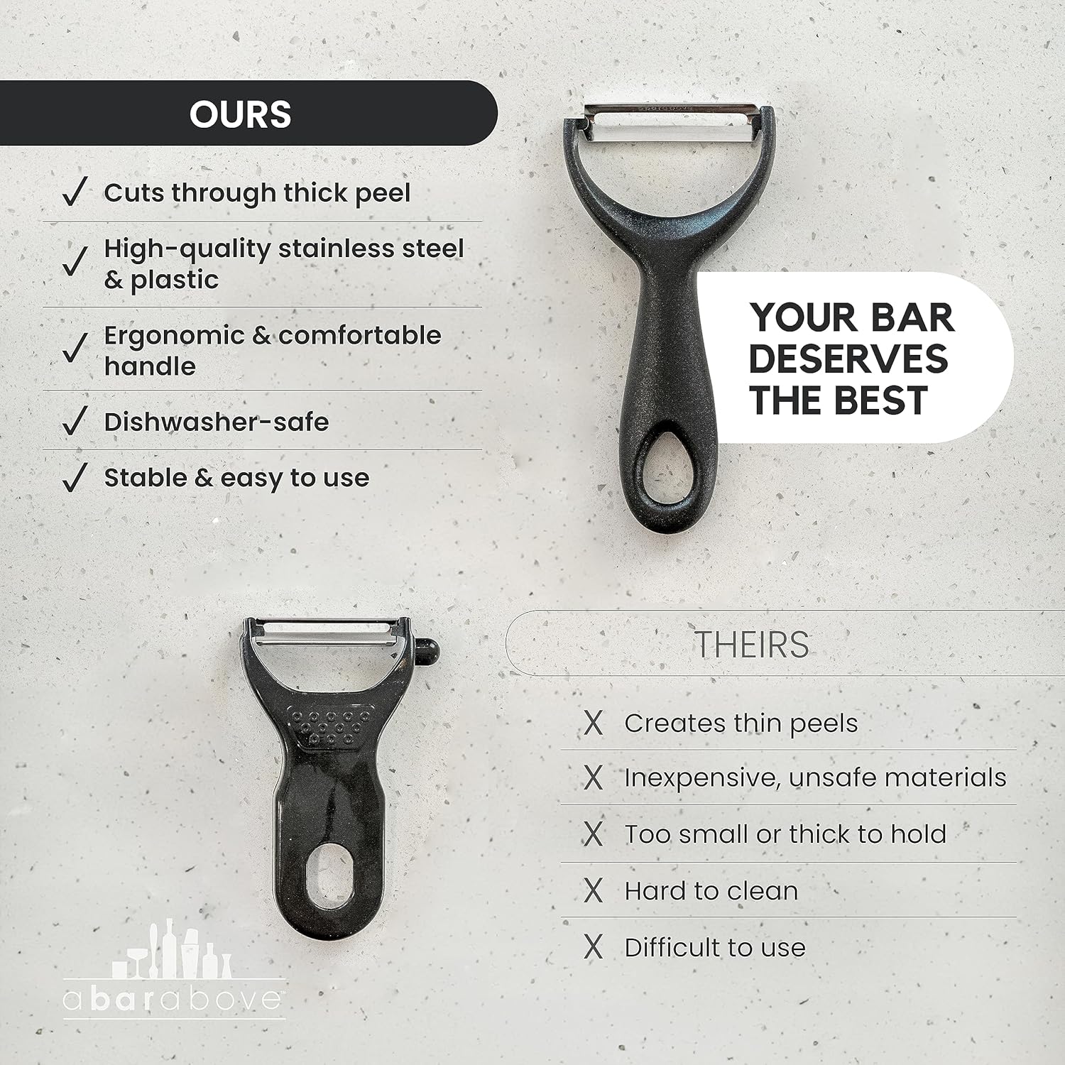 - COMPLETE YOUR BAR TOOL COLLECTION: A Bar Above offers a full line of professional bar tools, and this gold citrus peeler fits right in. Match it with our gold shakers, jiggers, and strainers for a premium bar kit. Whether you’re upgrading your tools or gifting someone who loves mixology, this peeler brings both function and style to any home or professional bar setup.