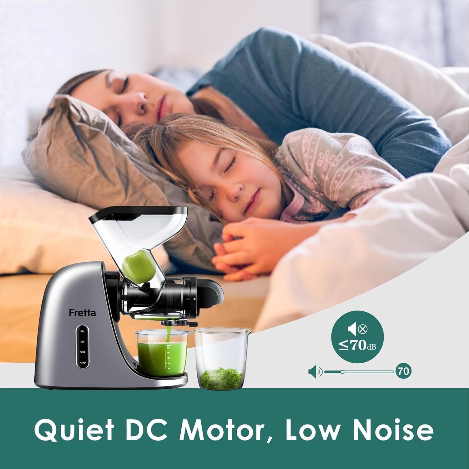 - 【 Powerful yet Quiet DC Motor】Fretta's masticating juicer machines are powered by a robust 200W DC Motor. Its high-torque, low-speed design operates quietly at low RPM, extracting deep nutrition from your favorite fruits and veggies. Enjoy a peaceful juicing experience with noise levels below 75 decibels.