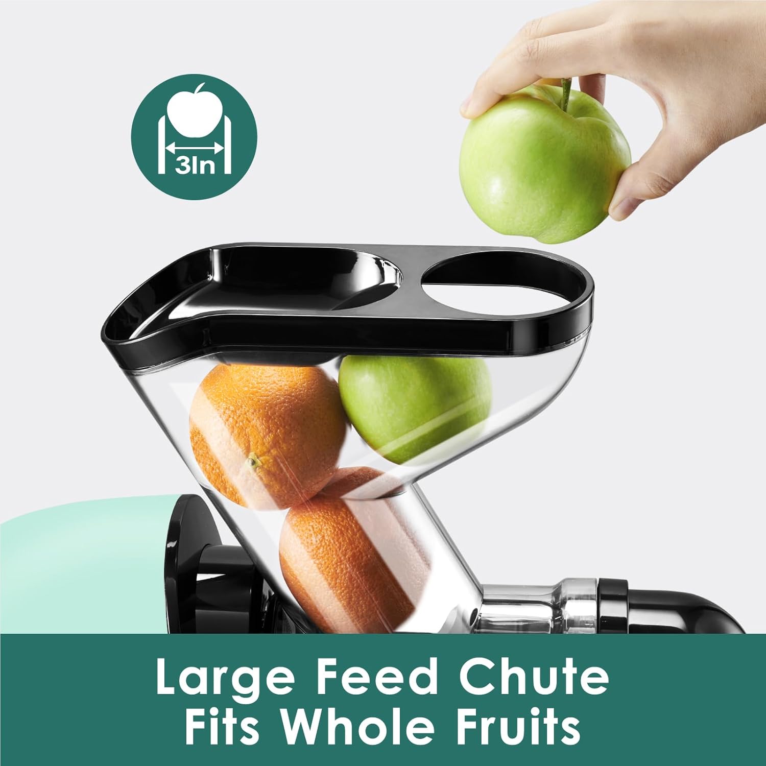 - 【Extra-Wide Feed Chute】The Fretta slow masticating juicer is equipped with 3-inch wide feed chute, making it easy to juice large pieces of fruits and vegetables without the hassle of tedious cutting.By minimizing chopping, the juice will be less oxidized, preserving its nutritional content. Tips: This juicer does not automatically remove fruit peels. The image is only for demonstrating the size of the feeding chute. Therefore, for better taste, it is recommended to remove the peels before jucing.