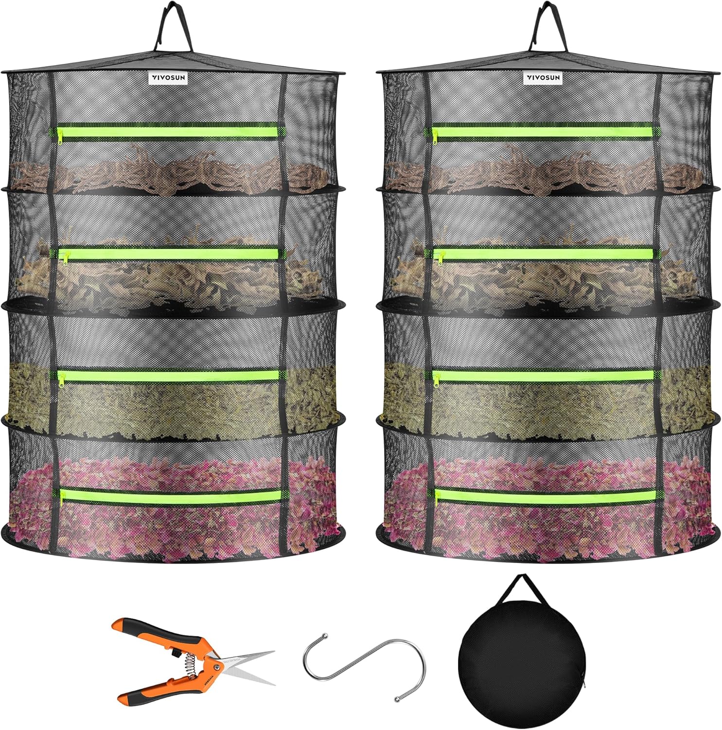 VIVOSUN 2-Pack 4-Layer Mesh Drying Rack Hanging Design with Green Zippers for Dehydrating, Indoor and Outdoor (Pruning Shears Included)