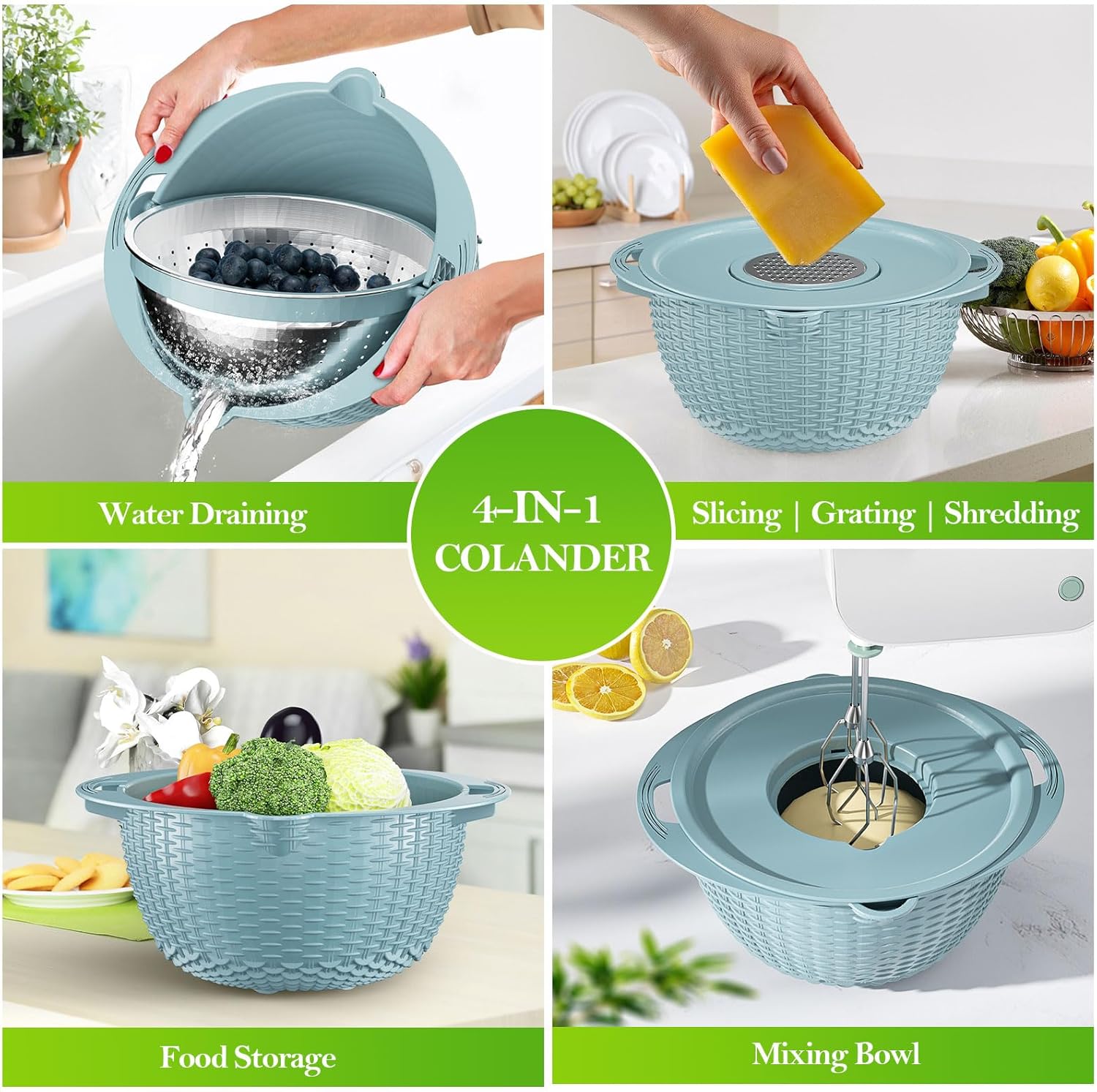 - Versatile Kitchen Strainer: The 4 in 1 colander set is really a fun kitchen presents, especially in apartment. It includes a stainless-steel khaki colander, a plastic fruit bowl with non-slid bottom, a center-removable lid and three grater attachments. The strainers and colanders are best for washing vegetable, rinsing rice fruits, straining pasta, preparing and storing food.