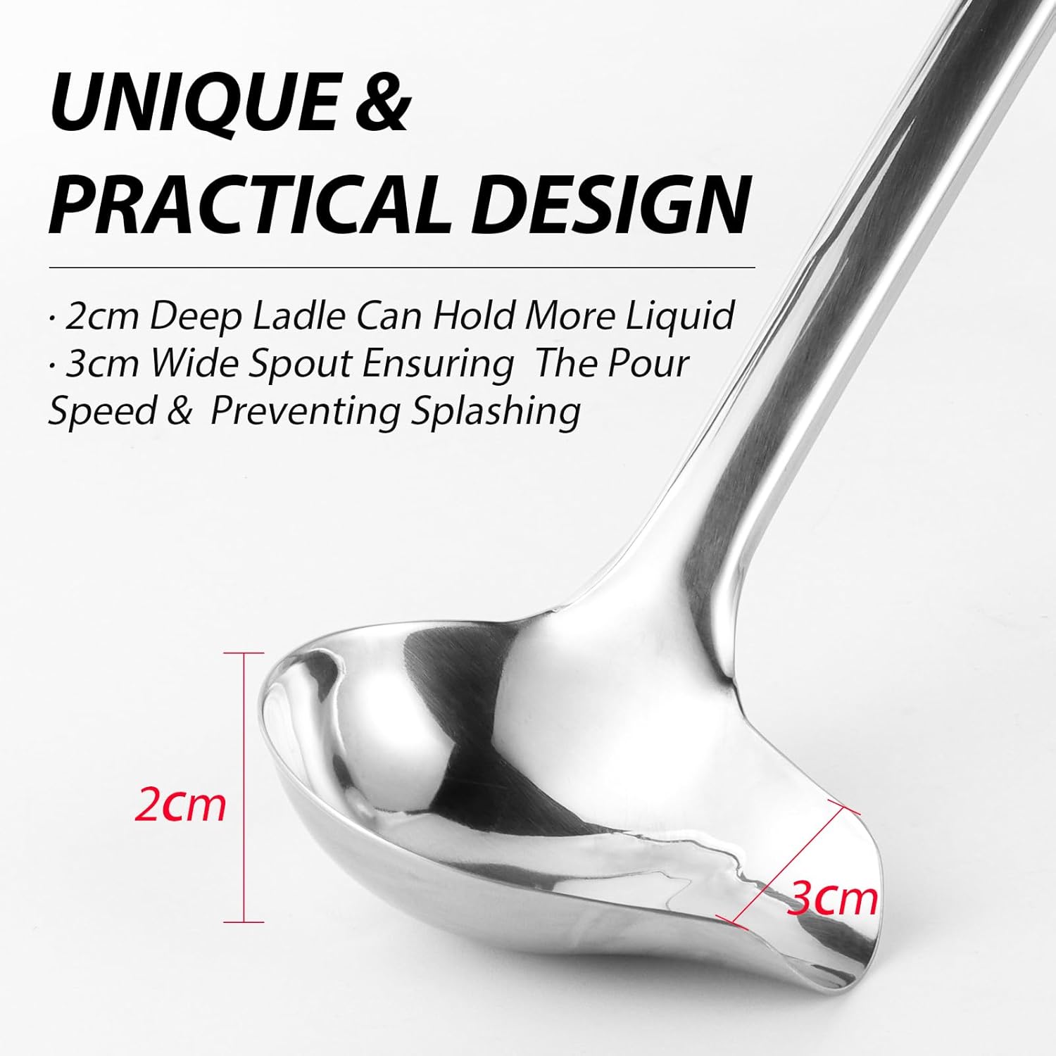 - 【POUR SPOUT DESIGN】The stainless steel soup ladle is great for drizzling sauces. You can precisely direct where you want to pour the gravy without any spill, keeping the dining table and kitchen clean