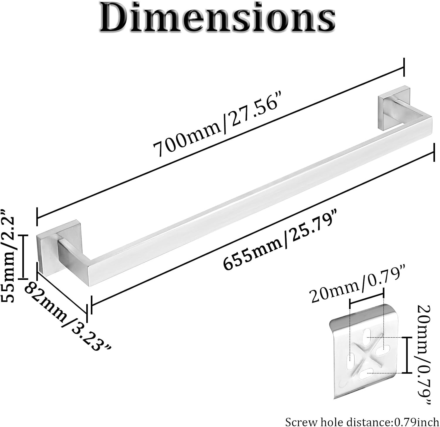 - 【Measure Before Buying】Dimensions 27.56''Lx2.2''Wx3.23''H, Useable Length 25.79 Inch towel hanger. 2.8 Inch Separation Distance from Wall - Enough space for quick drying, hanging towel quickly.No need to fold your towel any more.If you have any questions about the brushed nickel towel bar, please feel free to contact me at any time