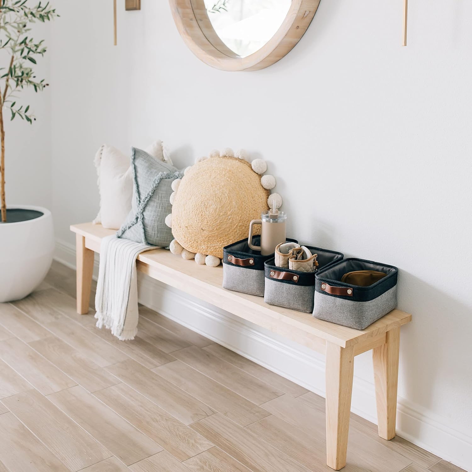 - Decorative Fabric and Vegan Leather – These versatile storage baskets for organizing your everyday life are made with a thick, high-quality fabric and fitted with leather handles to add a stylish touch to a living room, bedroom, office, or personal space.