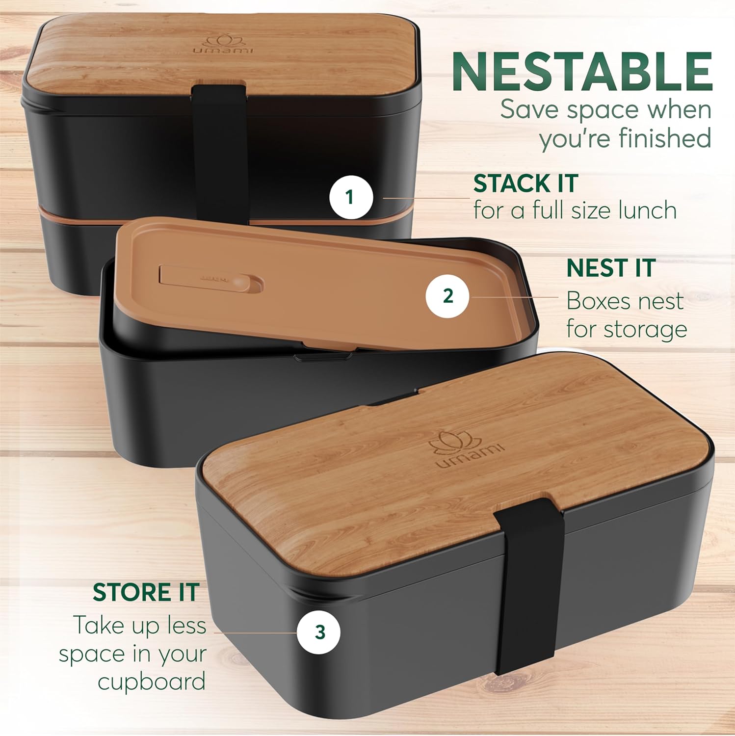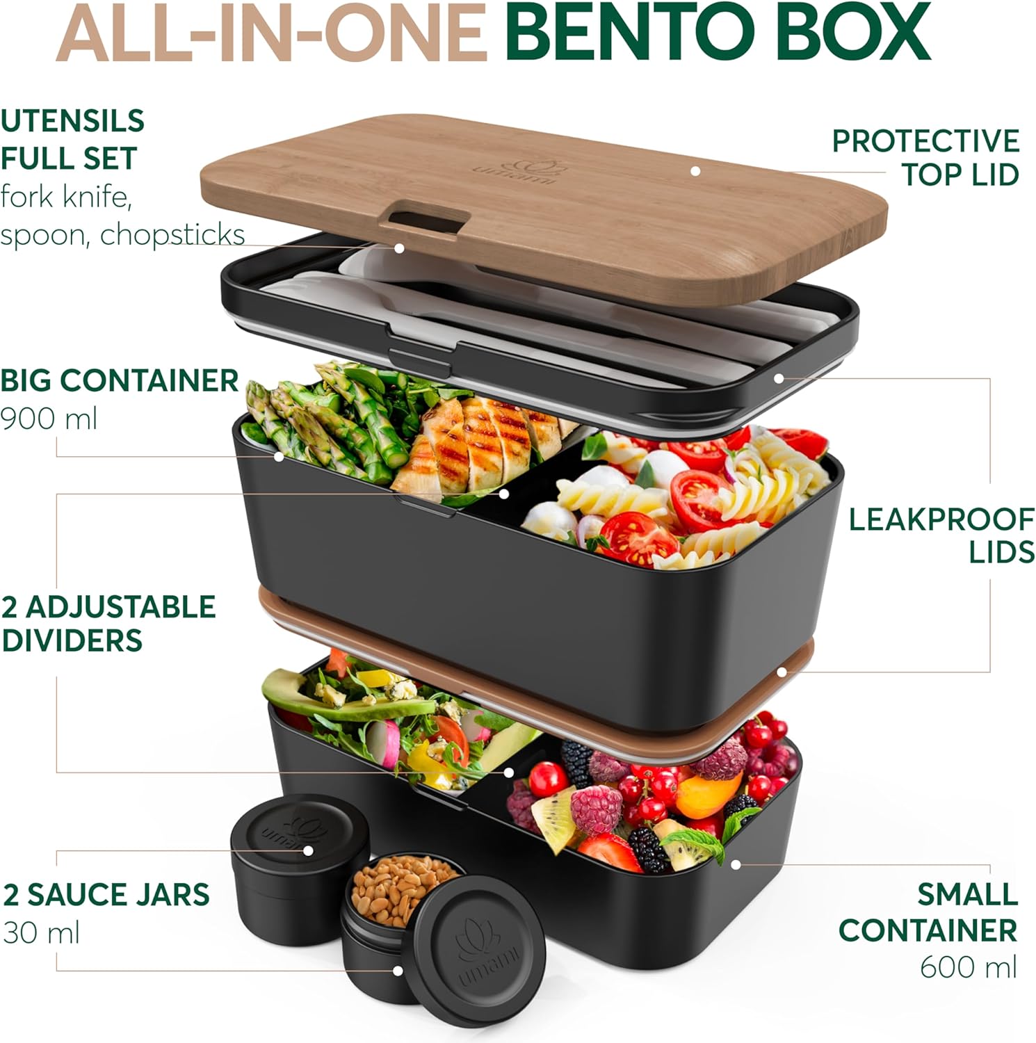 Umami Premium Lunch Box Containers w/ 4 Utensils, 2 Sauce Jars, Nestable Space-Saving Bento Box Adult, 100% Leakproof, Microwavable Lunch Containers for Adults, Cherry Black, 50 oz