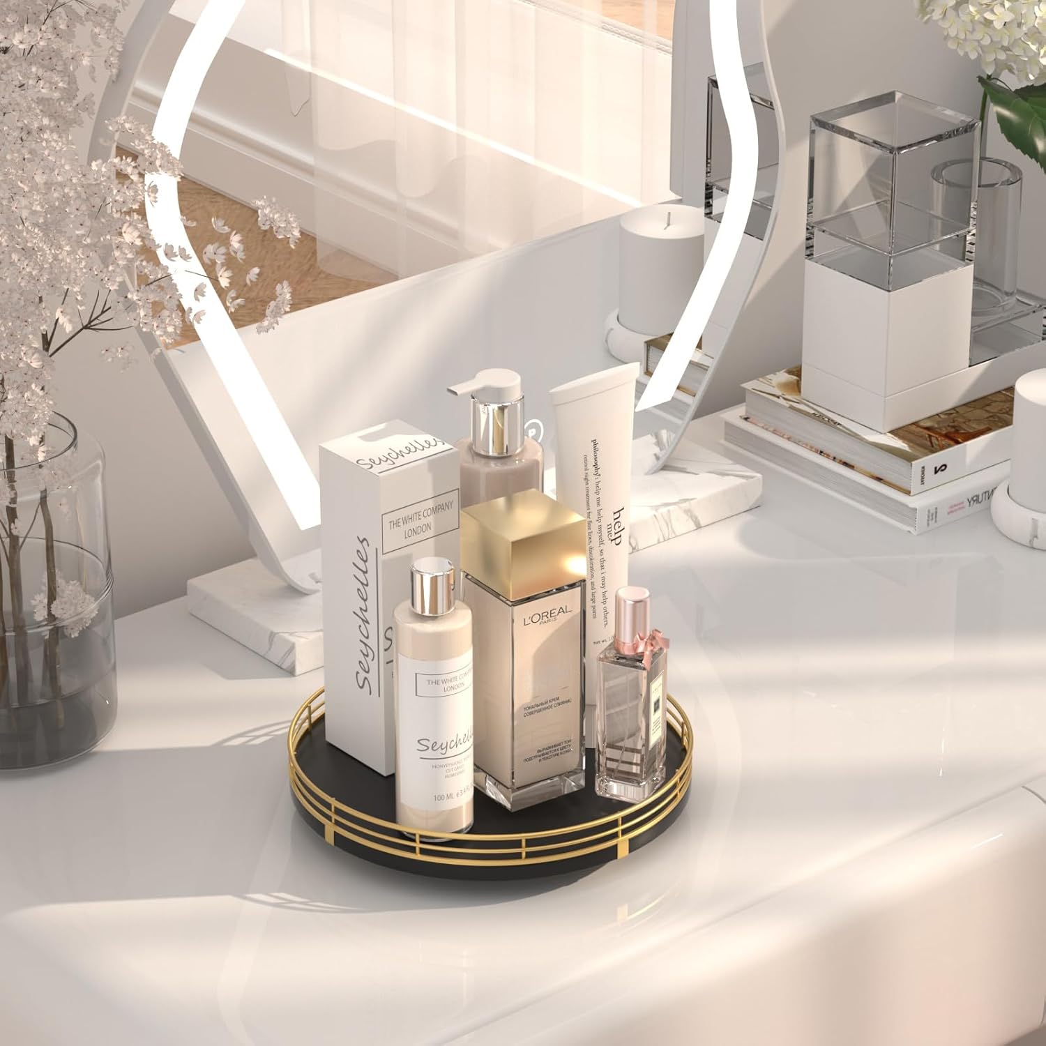 9" Oak Wood Bathroom Tray for Counter, Vanity Tray for Perfume Lotion Candle Makeup Jewelry Sink Soap Holder Turntable Dresser Organizer Countertop Coffee Table Decor Organization and Storage Gold