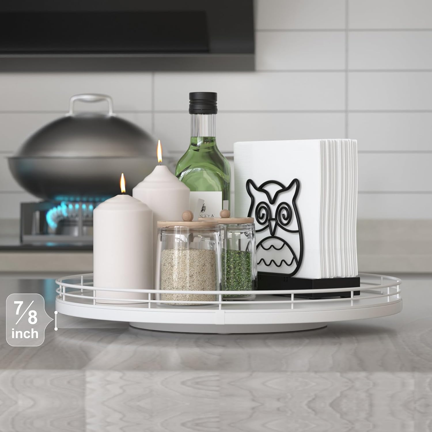 - ๐ง๐ต๐ผ๐๐ด๐ต๐๐ณ๐๐น ๐๐ฒ๐๐ถ๐ด๐ป: The turntable tray features a smooth and silent 360ยฐrotation; Bottom slip-resistant pads for stability and protect your countertop from scratches; Raised edges on each organizer tray to keep items from falling out; Easy to use, no installation required