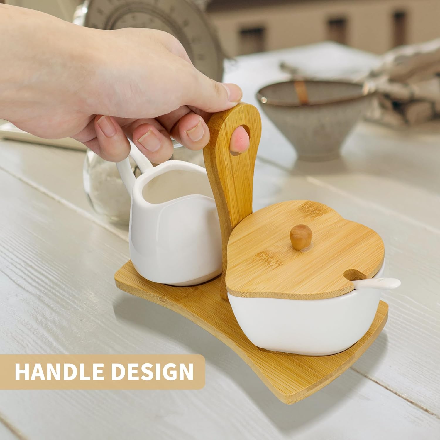 - HUMANIZED DESIGN - The wide handle design of the cream pitcher makes it comfortable to hold and the smooth drip-free spout allows it to pour the liquid more conveniently. The sugar jar comes with a lid that has a small cutout designed for spoon placement. The tray is designed to be portable and easy to move