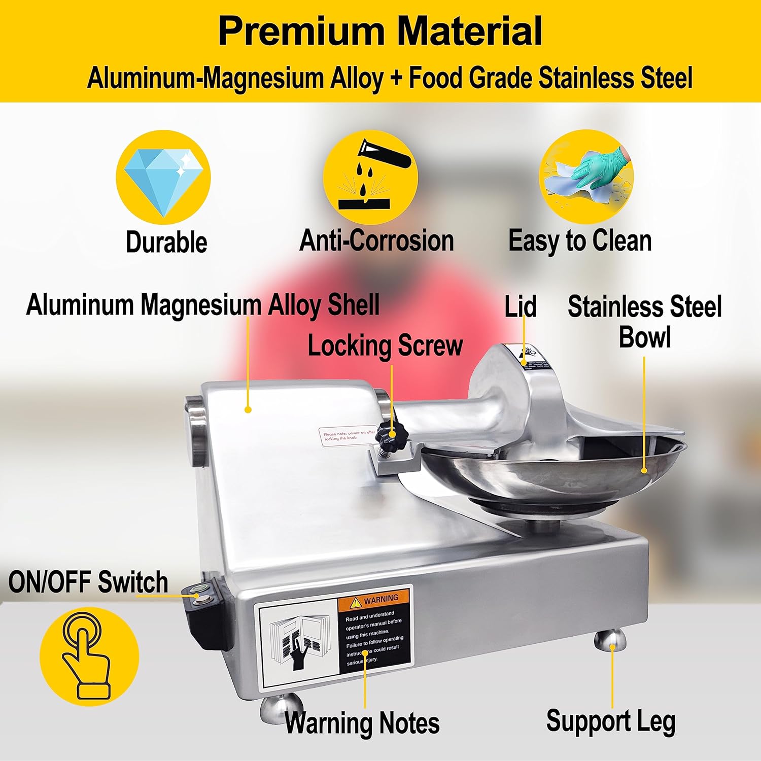 - Al-Mg Alloy Body: The food chopper features a durable and easy-to-clean body made of high-quality aluminum-magnesium alloy, ensuring smooth operation and long-lasting performance. Meat grinder bowl cutter machine also comes with non-slip feet for stable and secure operation.