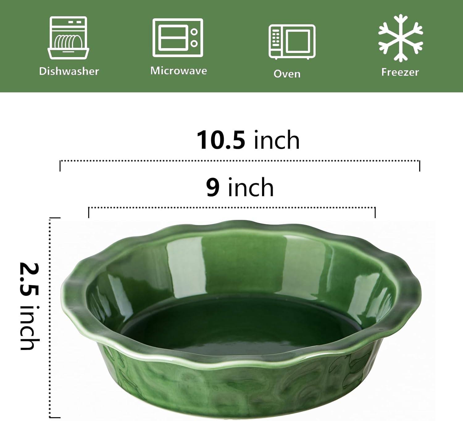 - GOOD SHAPE AND SIZE: Our pie dish is designed with you in mind with extra deep sides and fluted edges. With the inside measuring 9 inches wide and 2.5 inches deep, it will fit any standard pie recipe. The deep dish pie pan features reactive glaze color for enjoyable baking time.