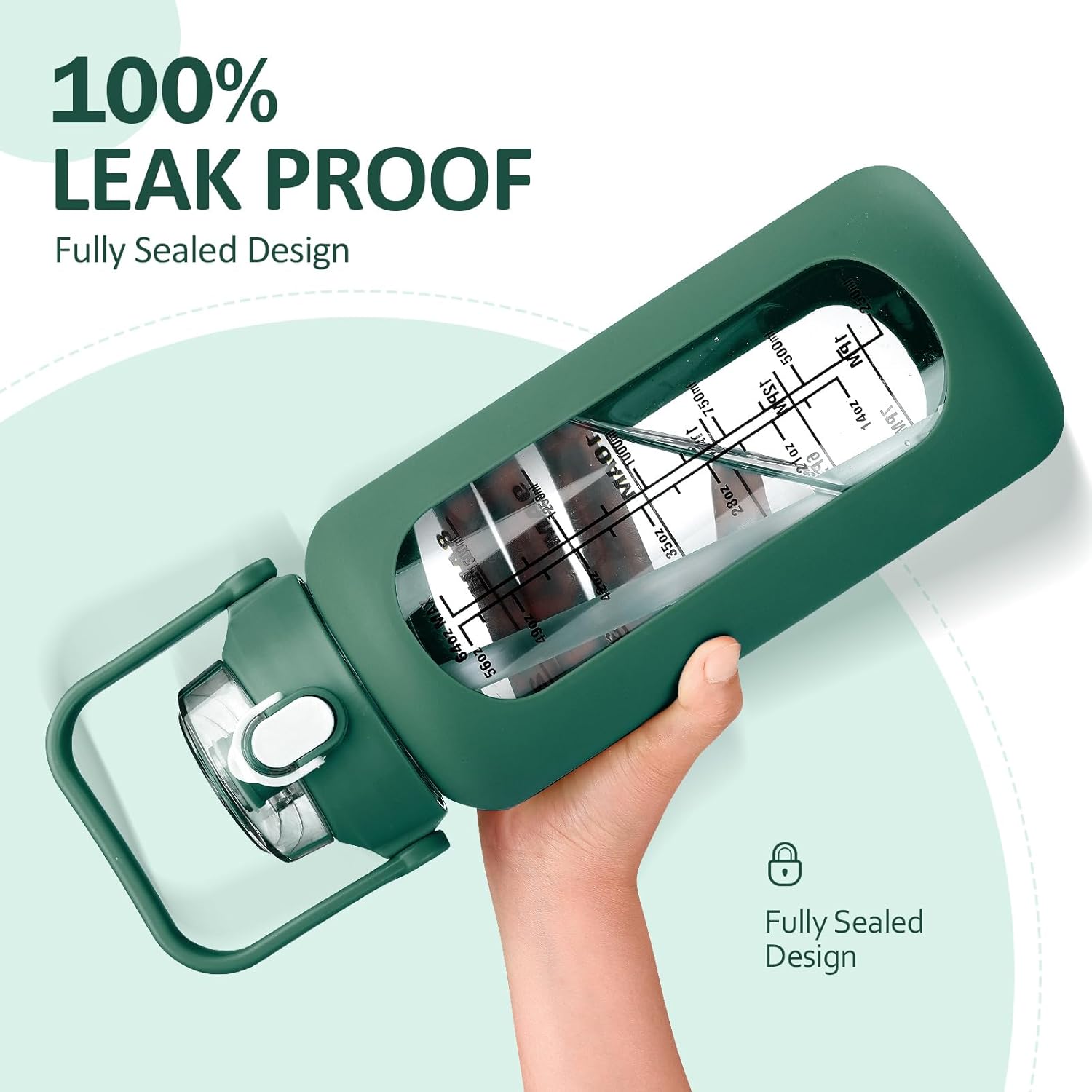 - ❤High-Quality Borosilicate Glass Bottle- This large motivational water bottle is made of odorless, quality, borosilicate glass. Straw and lid are made of food-grade PP, BPA-free and eco-friendly.