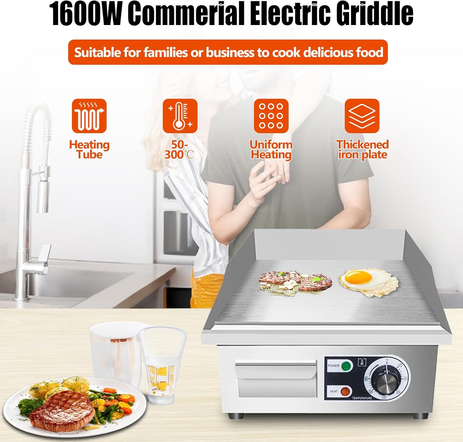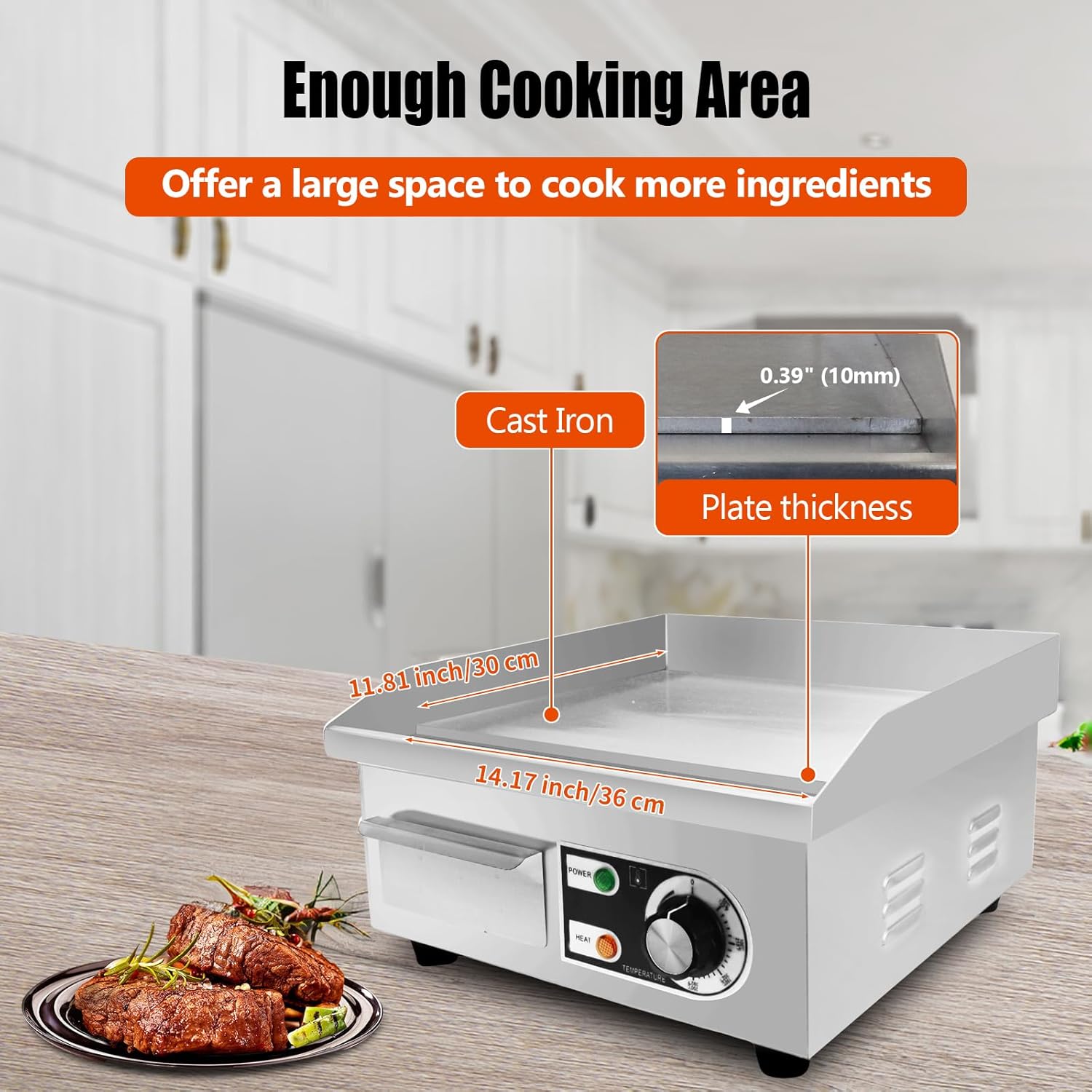 14" Commercial Electric Griddle,Electric Countertop Flat Top Griddle,110V 1500W Electric Flat Top Grill,Non-Stick Restaurant Teppanyaki Stainless Steel Grill,Adjustable Temperature Control