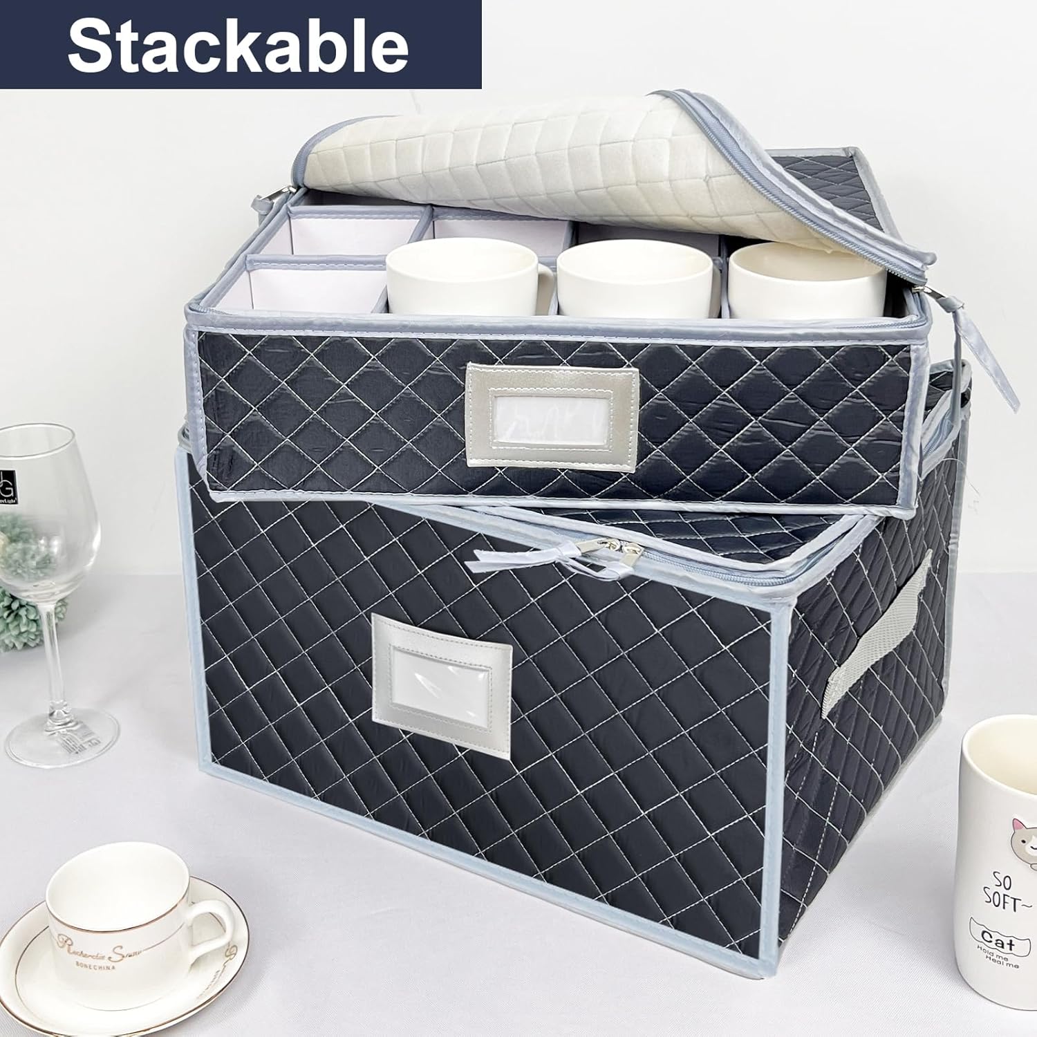 Wine Glass and Mug Storage Box with Dividers - 2 Pack China Storage Containers Set Holds 24 Glassware , Stemwareļ¼Coffee Mug and Tea Cup, Organizer Bin with Sturdy Metal Zipper,Label and Handles (Grey)