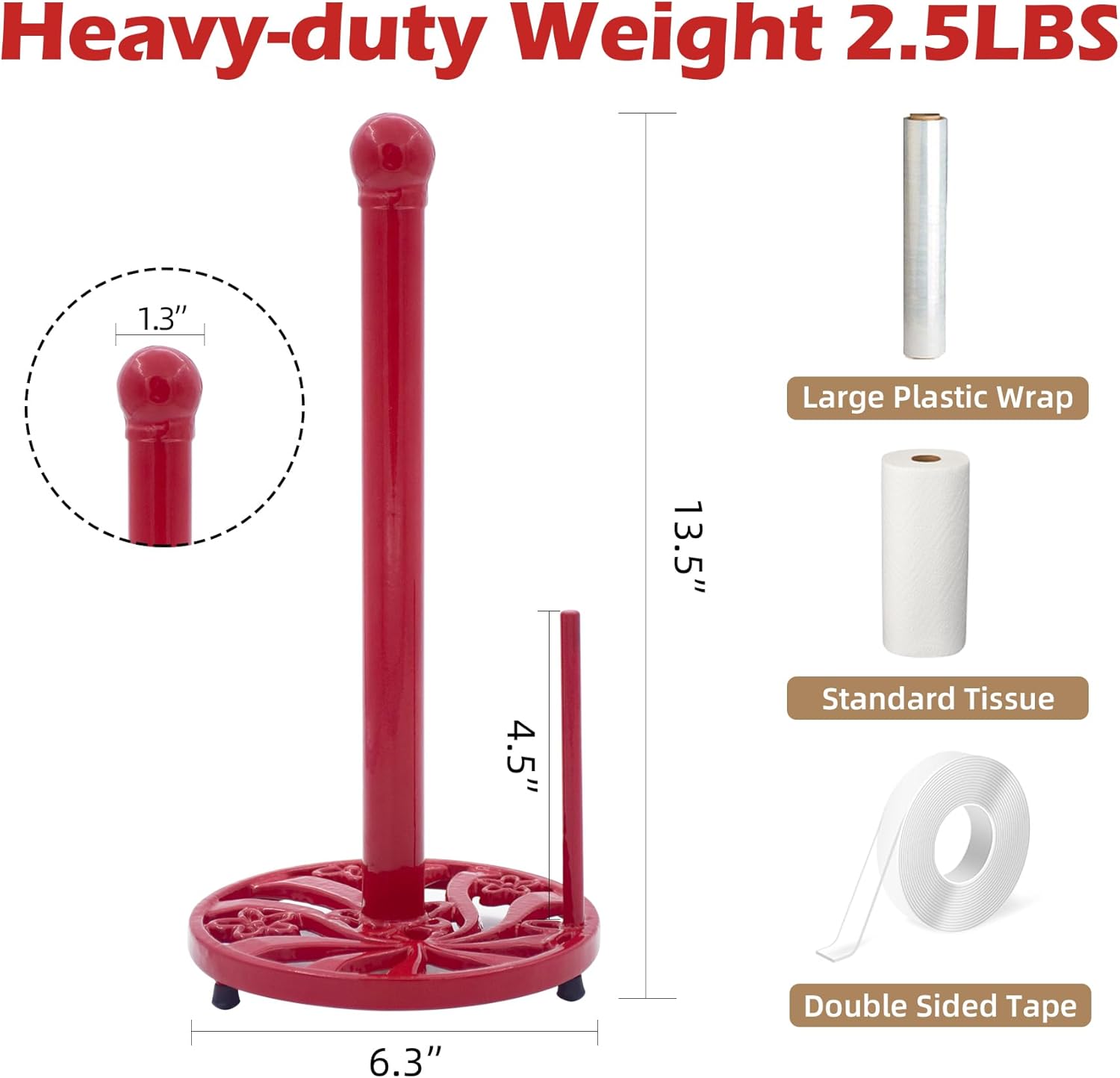 Vintage Paper Towel Holder Countertop - Cast Iron Standing Roll Paper Towel Dispenser with Elegant and Heavy Daffodil Pattern Base for Kitchen Décor, Red