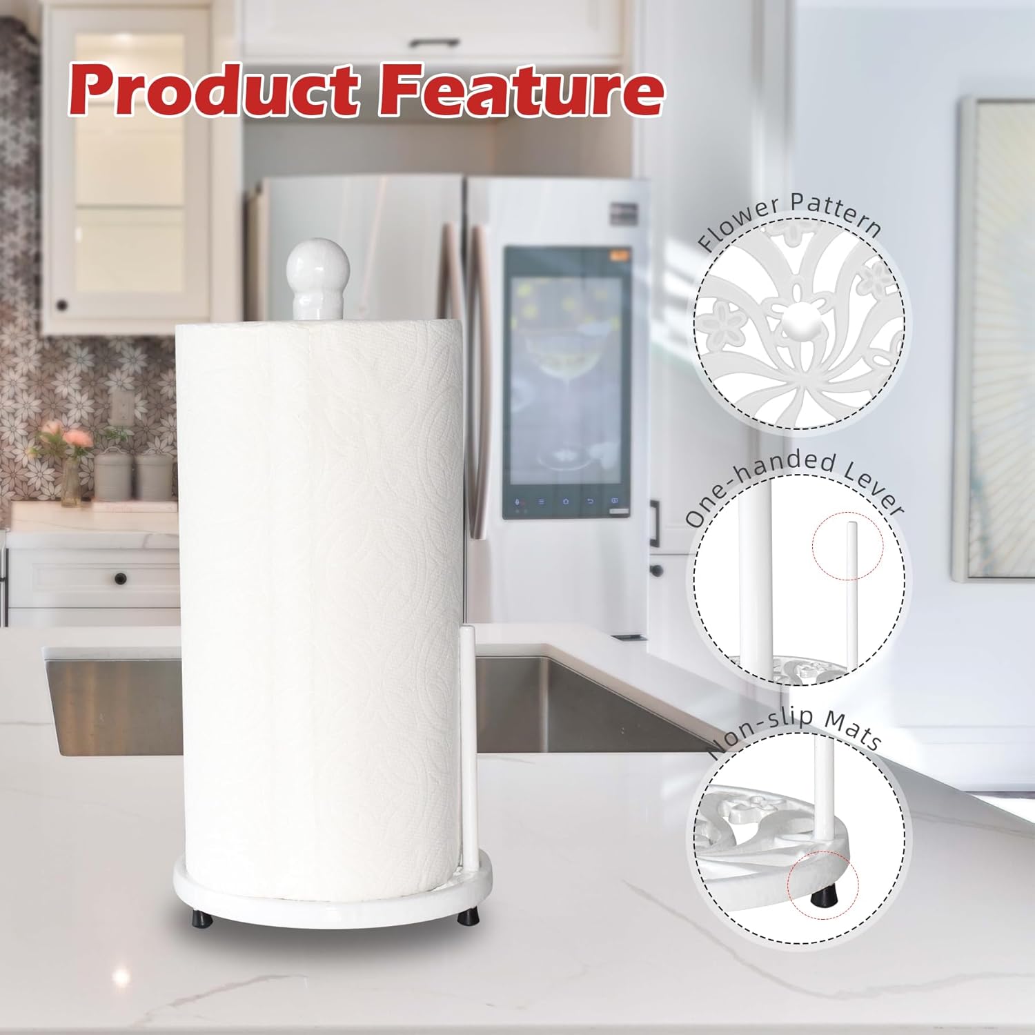 - 【Protective】The paper towel holder features three 0.9-inch high non-slip feet beneath its base, offering multiple benefits. Not only do they enhance stability, but they also protect your countertops from scratches and prevent clean paper towels from coming into contact with any stains or spills on the surface.