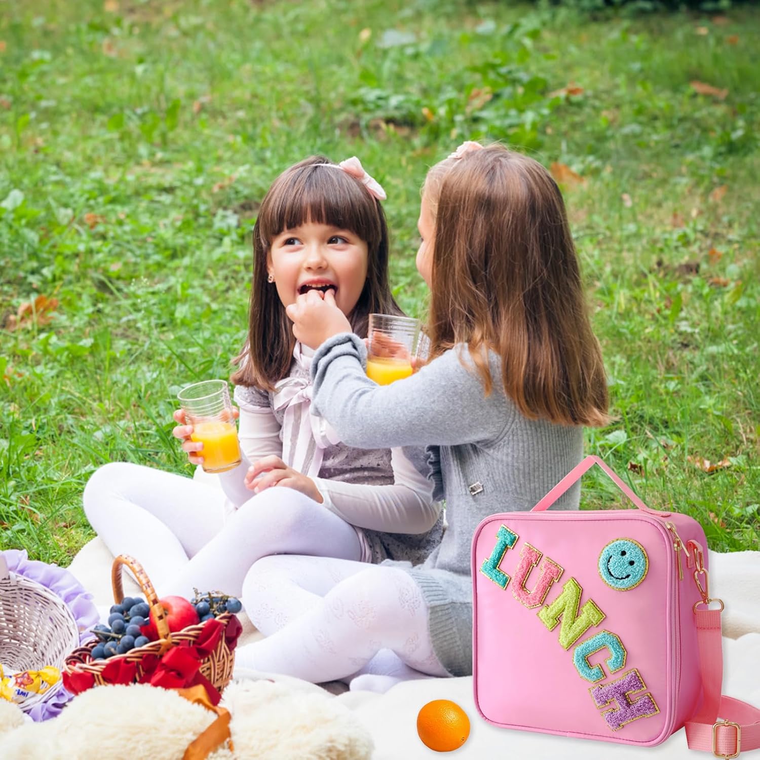 Insulated Lunch Bag With Adjustable Shoulder Strap, Nylon Preppy Lunch Box Large Insulated Lunch Bag Reusable Lunch Tote Bag with Smiley Preppy LunchBag for Girls School Travel Picnic (Pink)