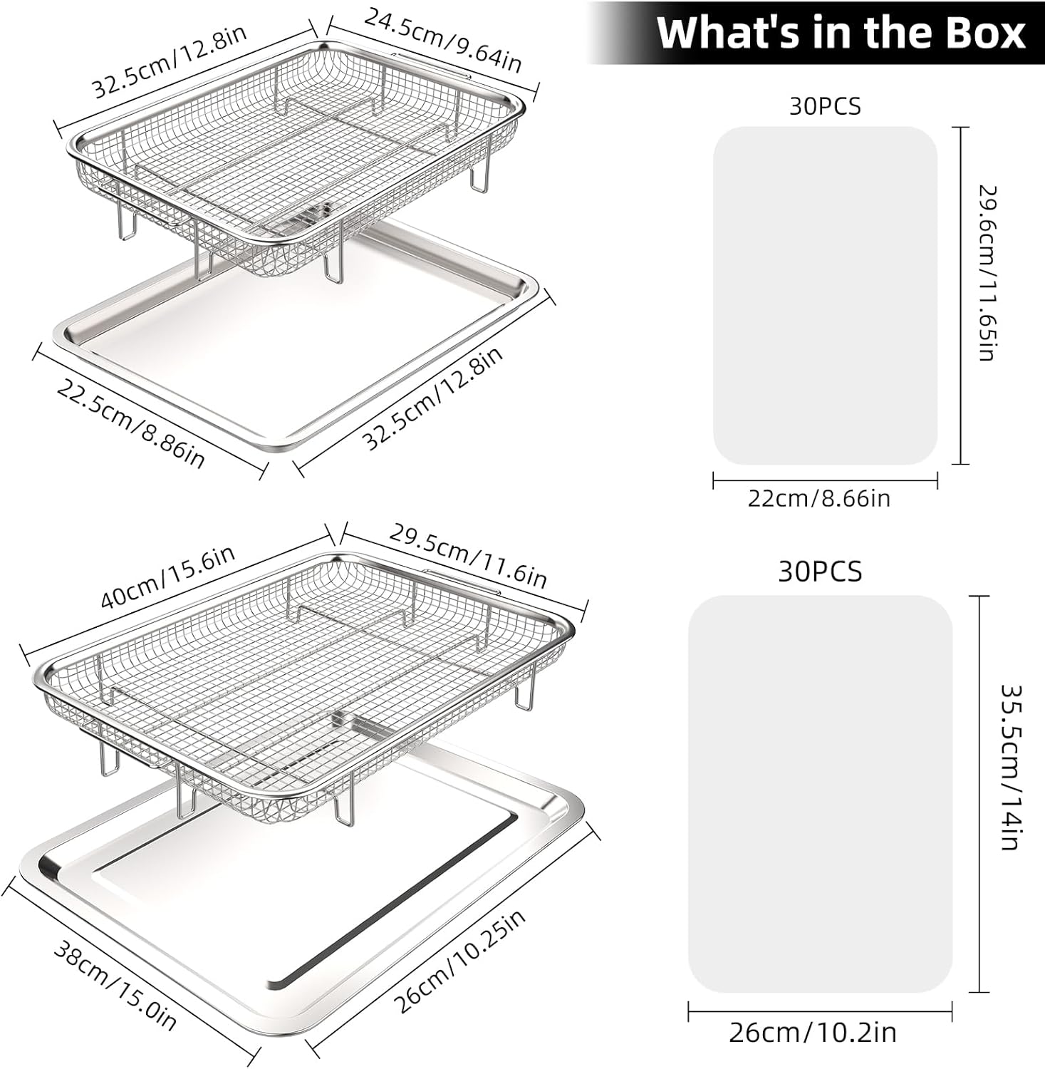 - 【Great Value with Pack of 6】Package includes 2-pieces Large Air Fryer Basket and Tray Set sized at 15.6×11.6 inches, 2-pieces Medium Set sized at 12.8×9.6 inches, and 2 packs of pacherment papers(30 count/ size), ideal for most regular oven with air fry option or wall oven. Can work perfectly together and superbly apart.