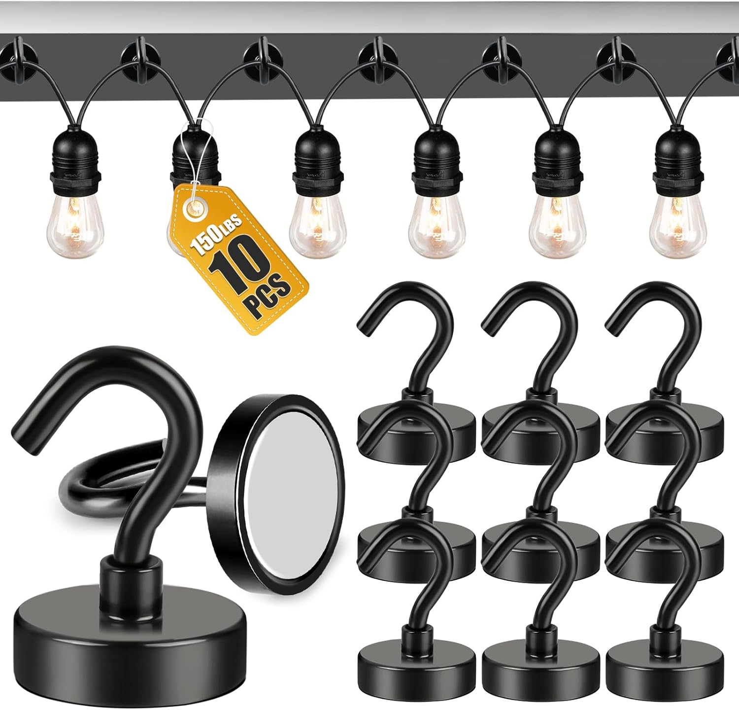 DIYMAG Outdoor Hooks for Hanging String Lights, Balck Magnetic Hooks Strong 150lbs+ Hanging Party Light Wall Cable for Outside 2025 Cruise Cabin Refrigerator Fridge Grills Must Have 10PCS