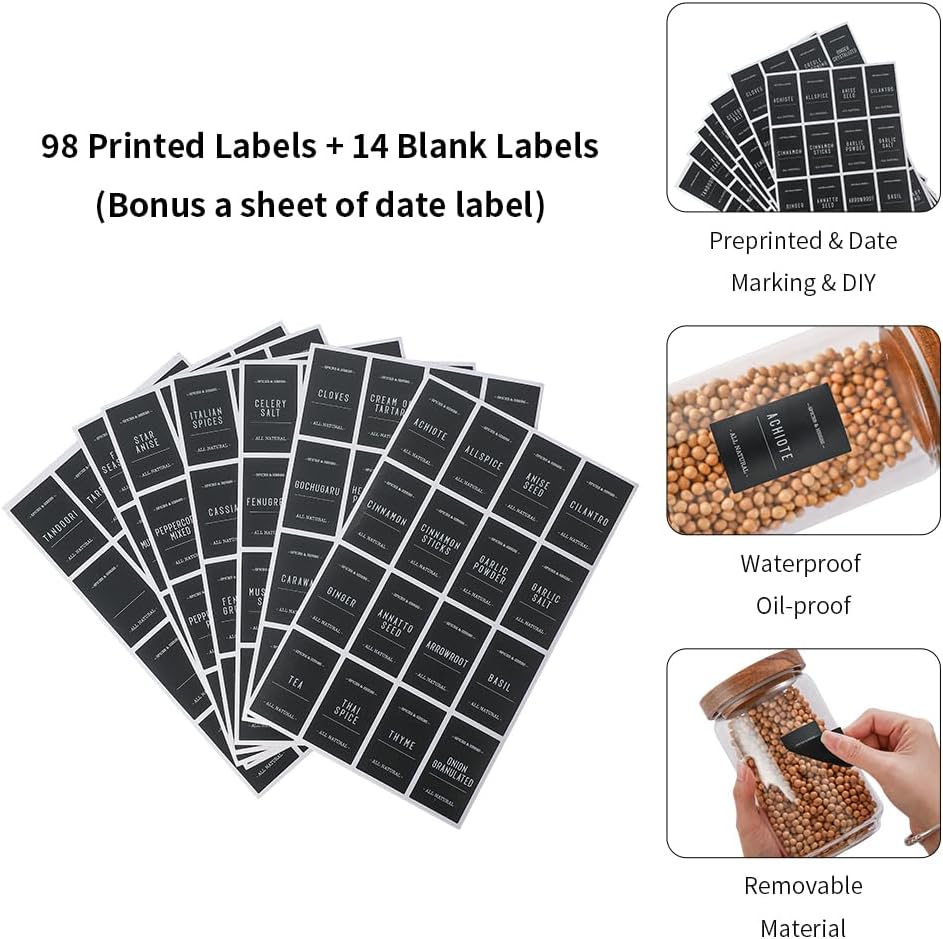 - What You Get - This set include 112 pcs labels (98 printed labels + 14 blank labels) and a marker for you to DIY.