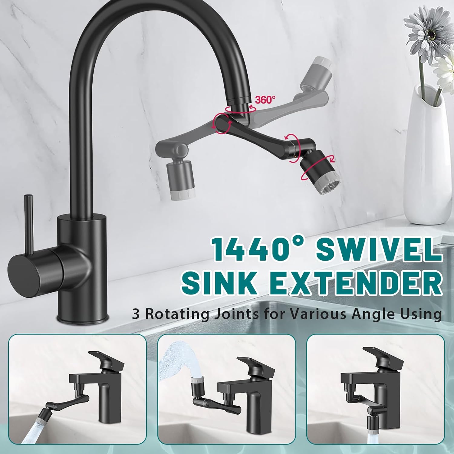 - 【1440 Sink Faucet Extender Aerator】CECEFIN 1080 Swivel robotic arm has 3 joints rotation at 360 degree. Effectively extension faucet water flow and raise water spout height, more convenient for tooth brushing, shaving and toddlers hands washing, especially for children, the aged, and long-hair women