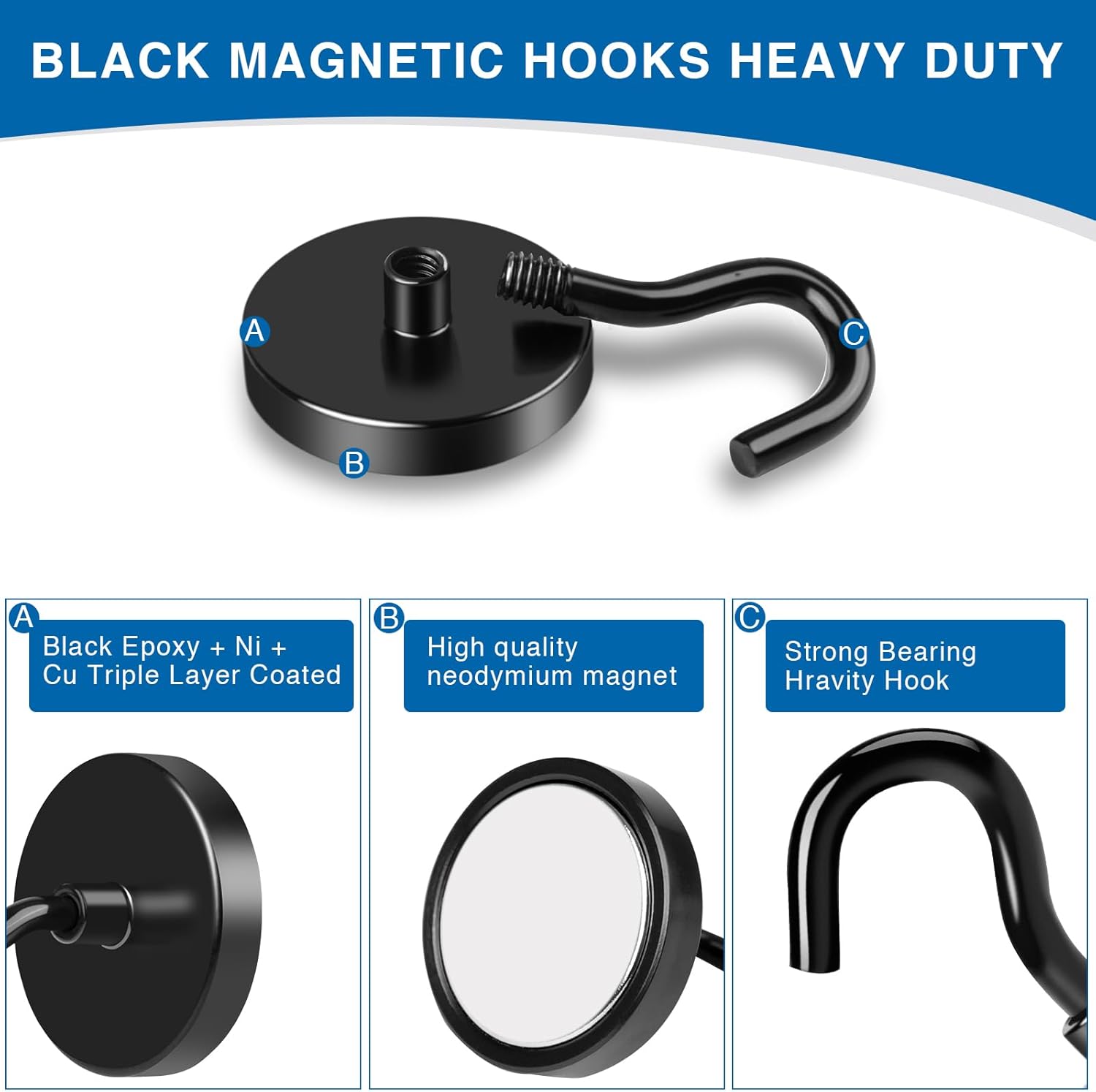 - 【HIGH QUALITY COATING】Black magnetic hooks are coated with triple layer of Black epoxy+ Nickel+ Copper, which greatly enhances magnets with hooks corrosion resistance. The layer of heavy duty hook not only provides a shiny and rust resistant surface, but also helps prevent the metal hooks for hanging from breaking or cracking.