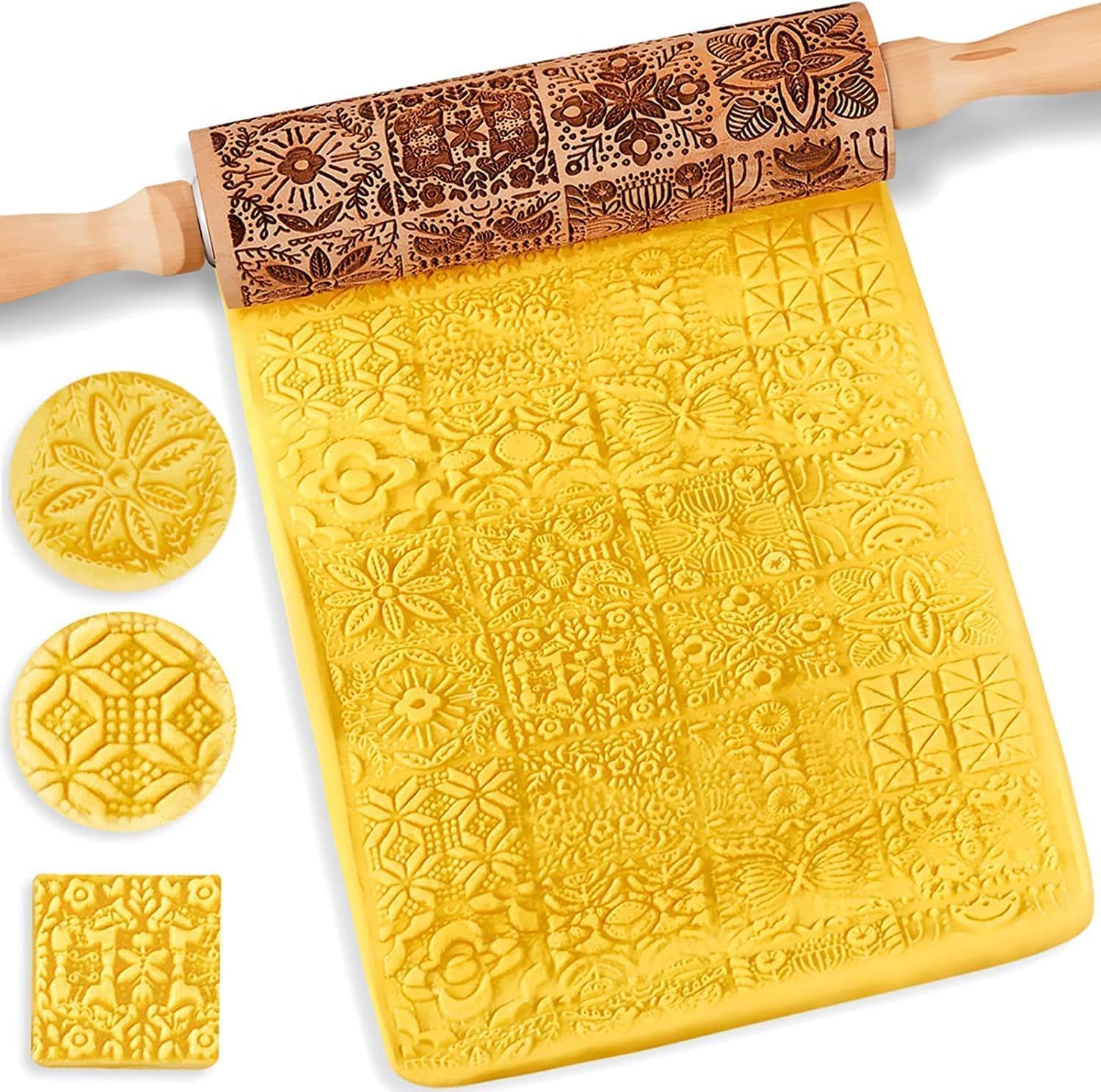 - Kitchen Essential Tool:The embossed rolling pin saves time for decorating and designing biscuits, and baking with an embossed rolling pin can be fun, especially for children. You can let your children make their own biscuits, suitable for rolling pasta, cookie dough, pastries, bakery, pizza, fudge, pancakes, etc
