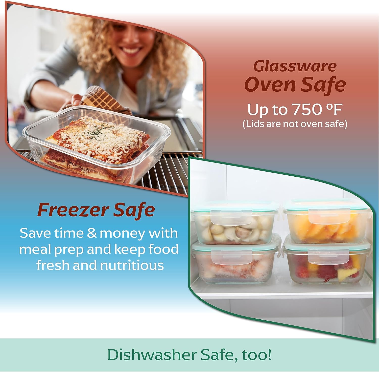 - SAFE & FOOD FRIENDLY: Glass base is oven safe up to 752℉, Lids are also refrigerator, freezer, microwave, and dishwasher safe.100% BPA-Free and are safe to use in the microwave