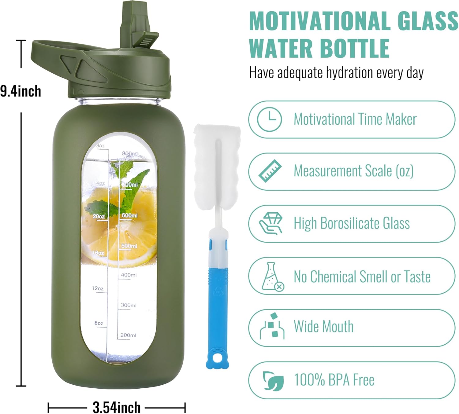 CIVAGO 32 oz Glass Water Bottle with Straw and Handle, Large Sports Motivational Water Bottle Flask with Time Marker, Leakproof Water Jug Canteen with Silicone Sleeve for Gym,Army Green