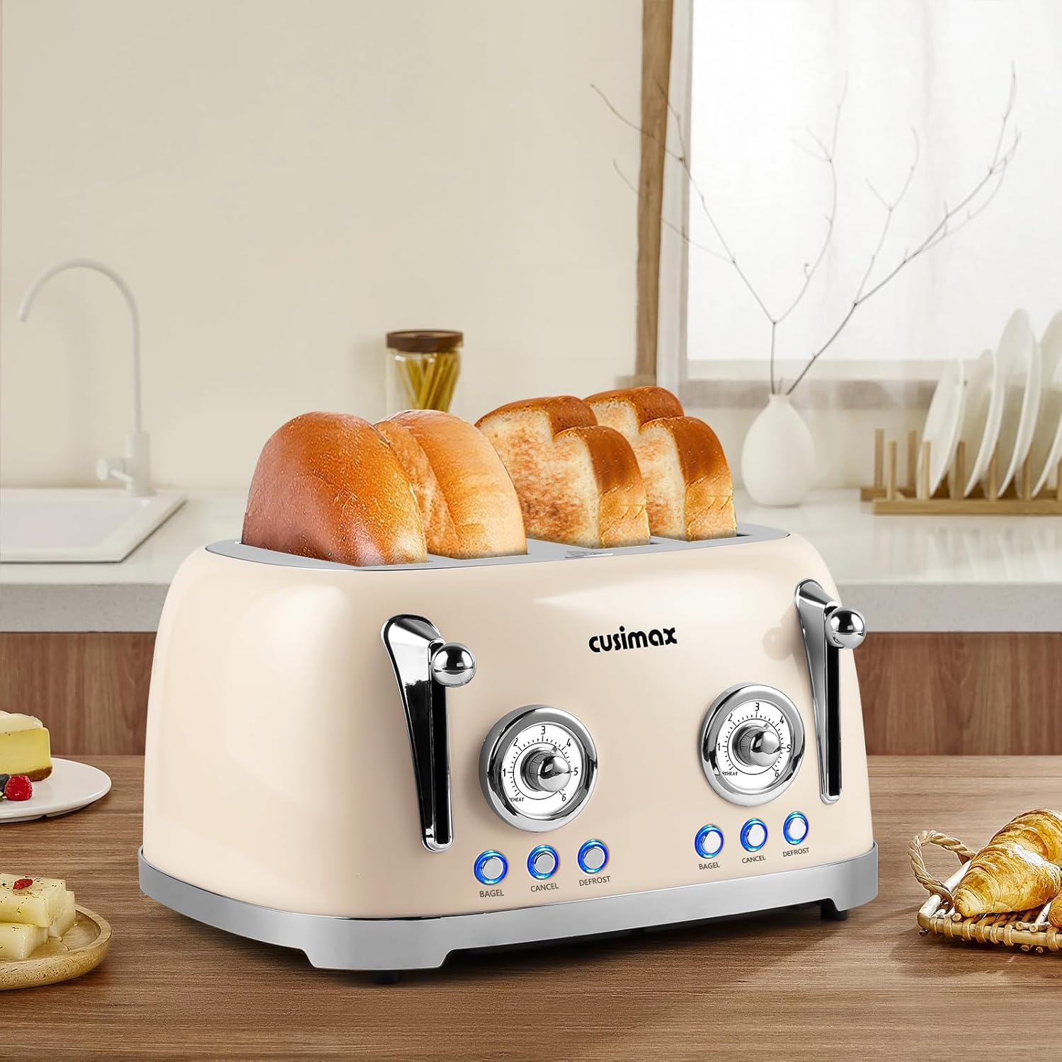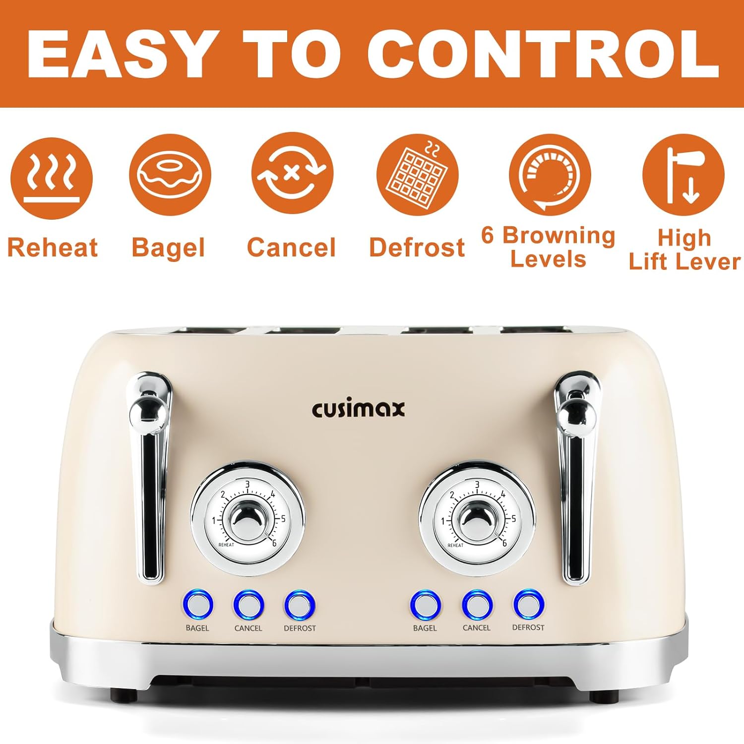 CUSIMAX Retro 4 Slice Toaster With Wide Slots for Bagels, Stainless Steel, 6 Toast Settings, Bagel, Cancel, Defrost & Reheat Functions, Dual Independent Control Panels, Cream
