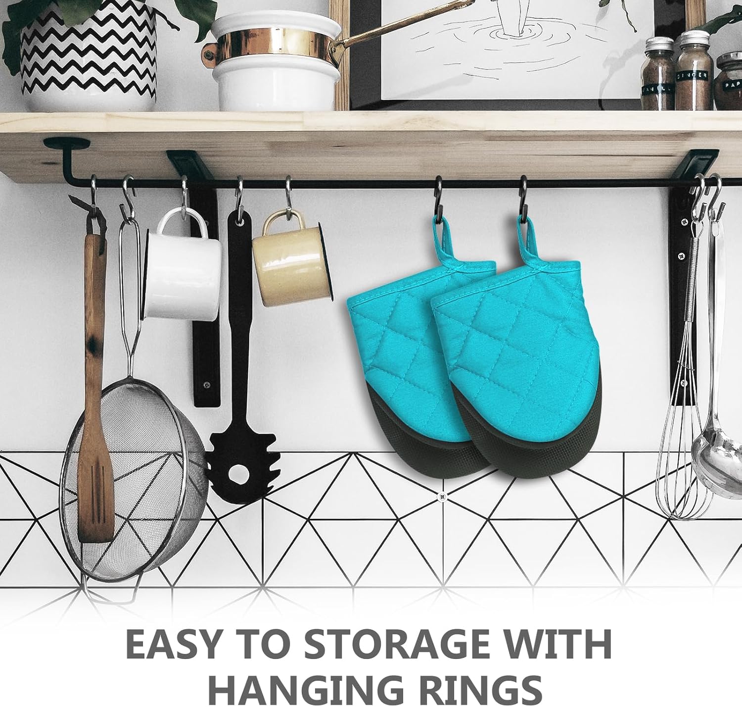 1 Pair Short Oven Mitts - Silicone Kitchen Oven Gloves High Heat Resistant 500℉, Mini Oven Mits with Non-Slip Grip Surfaces and Hanging Loop for BBQ, Baking, Cooking and Grilling (Coral Blue)